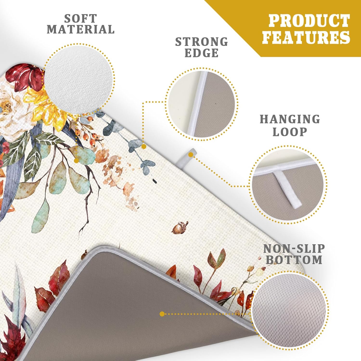 Giwawa Fall Dish Drying Mat for Kitchen Countertop, Watercolor Autumn Teal Blue Orange Pumpkins Floral Dish Drainer Mats, Thanksgiving Harvest Absorbent Dish Drying Pad Decor, 18x24 inch Large
