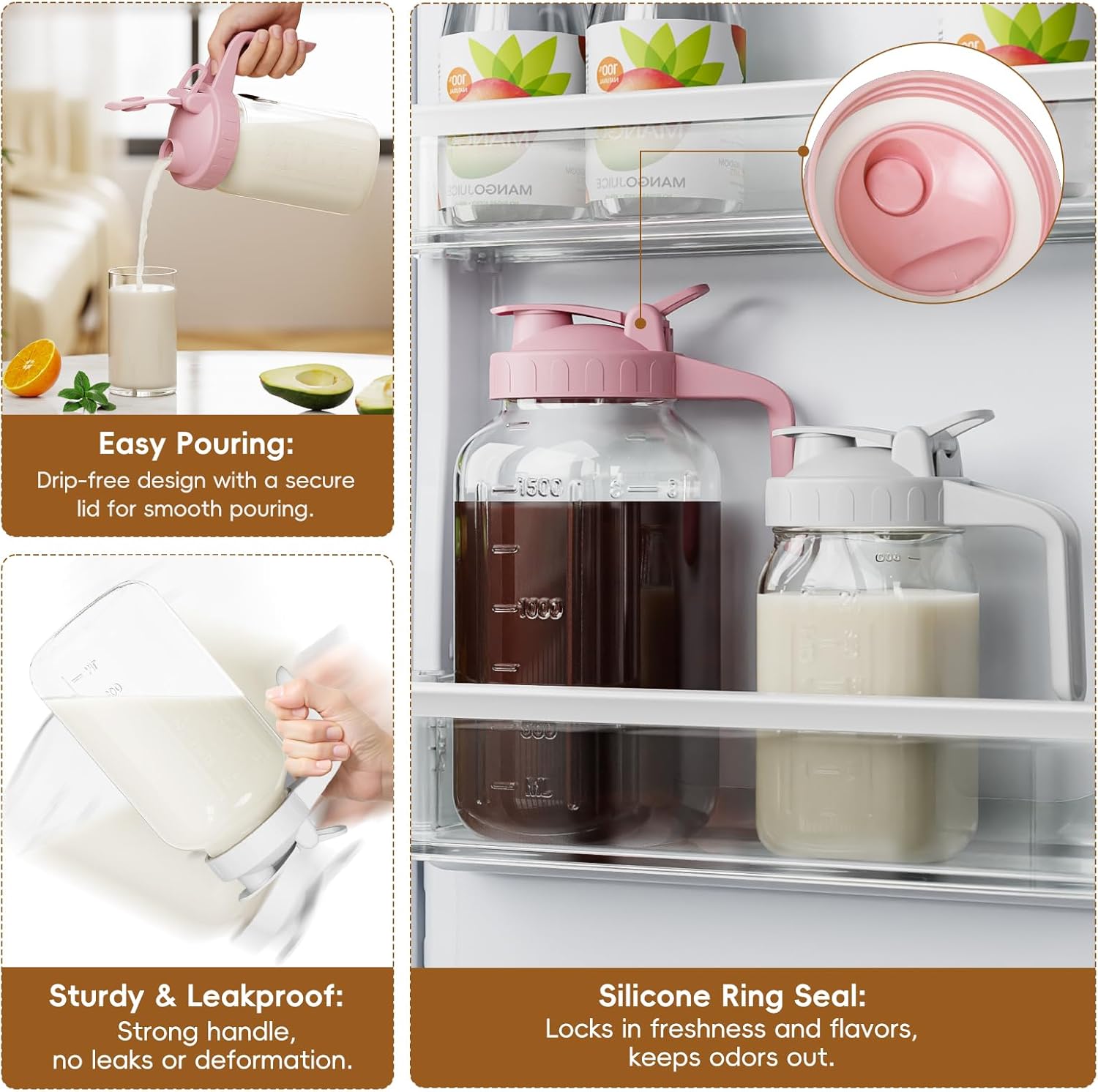 - 【Spout Sealed Lid with Handle】 - The 32oz jug with silicone seal in the pour spout lid, Leak proof and better maintain the freshness and taste of the beverage, avoid mixing the smell of other foods in the fridge. The flip-top lid is easy to pour and the jug is securely fastened to the lid