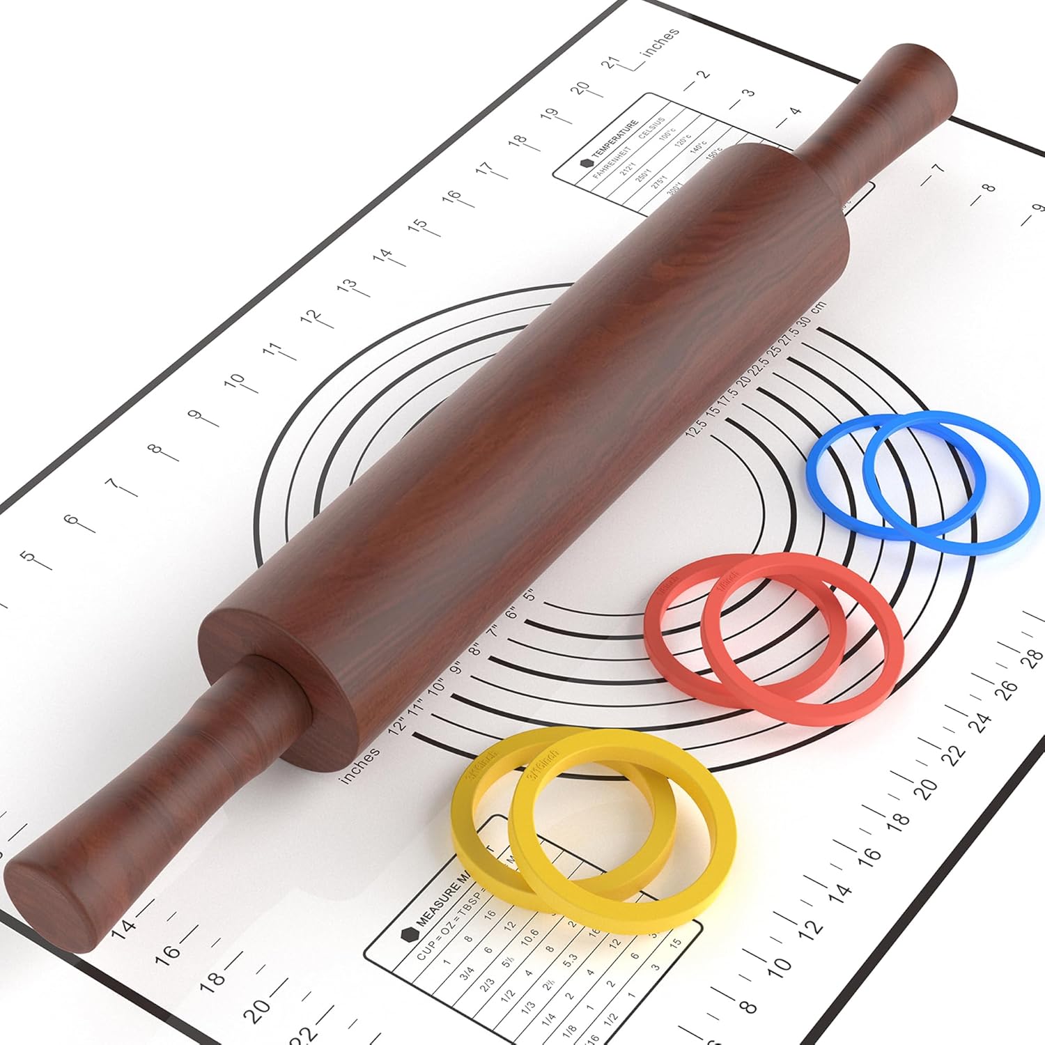 Classic Wooden Rolling Pin with Handle and Pastry Mat for Fondant, Pizza, Pies, Cookies,Rolling Pin for Baking with 3 Multi-Color Thickness Rings,17" x 2.5" (Include handle)
