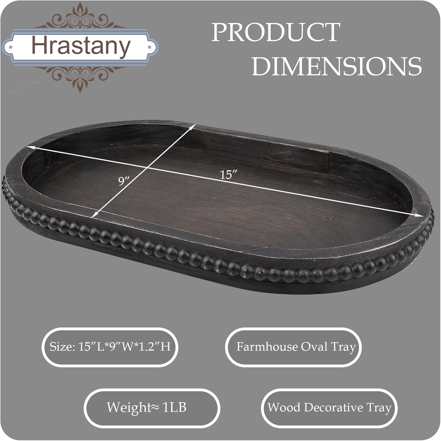 Vintage Black Oval Wood Decorative Ottoman Tray for Coffee Table Kitchen Counter, Living Room, Handcrafted Wooden Serving Tray for Table Centerpiece