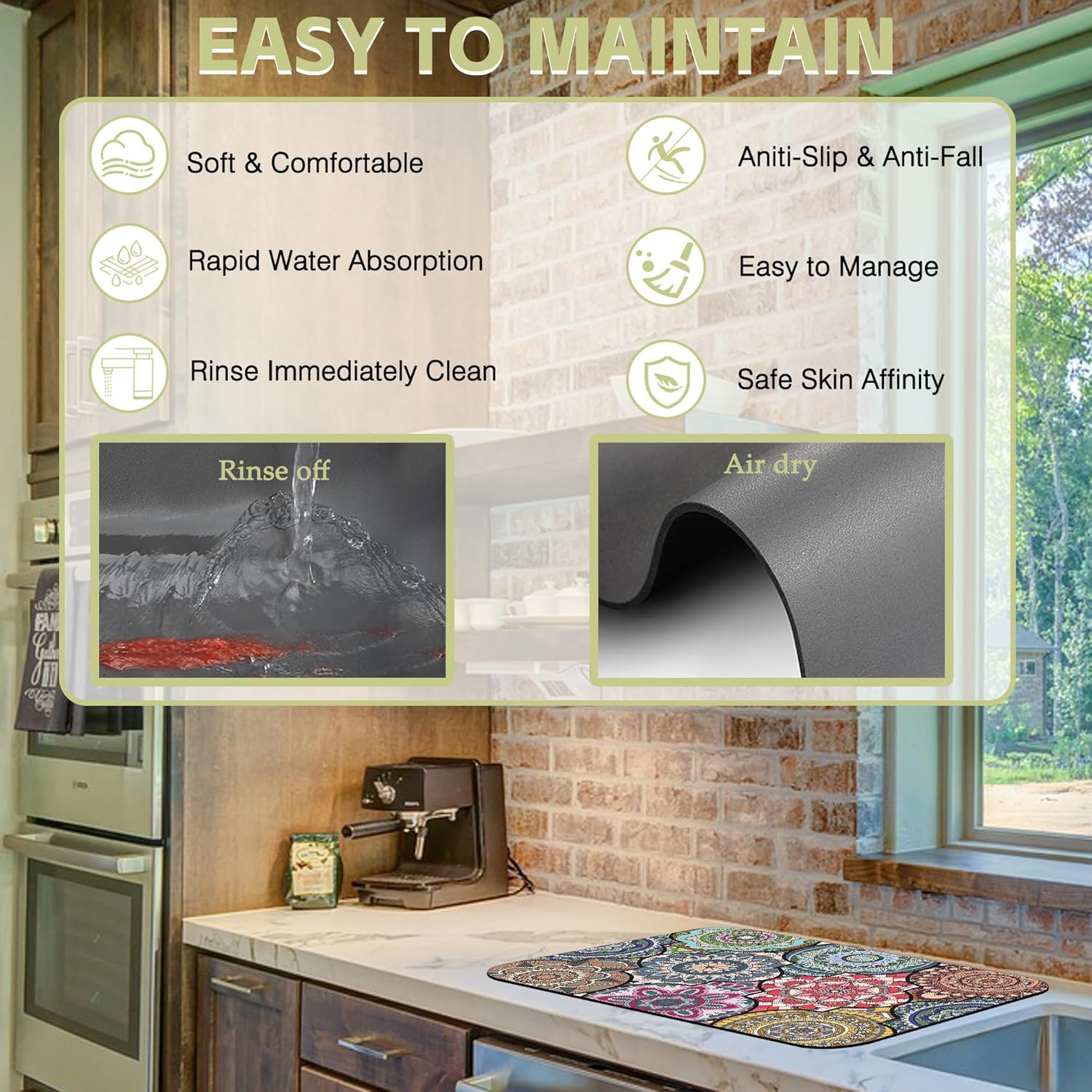 - Material and sizes:This kitchen mat is made of absorbent suede,diatom mud and non-slip rubber,two sizes:12" X 19" and 16" X 24" it fits most counters