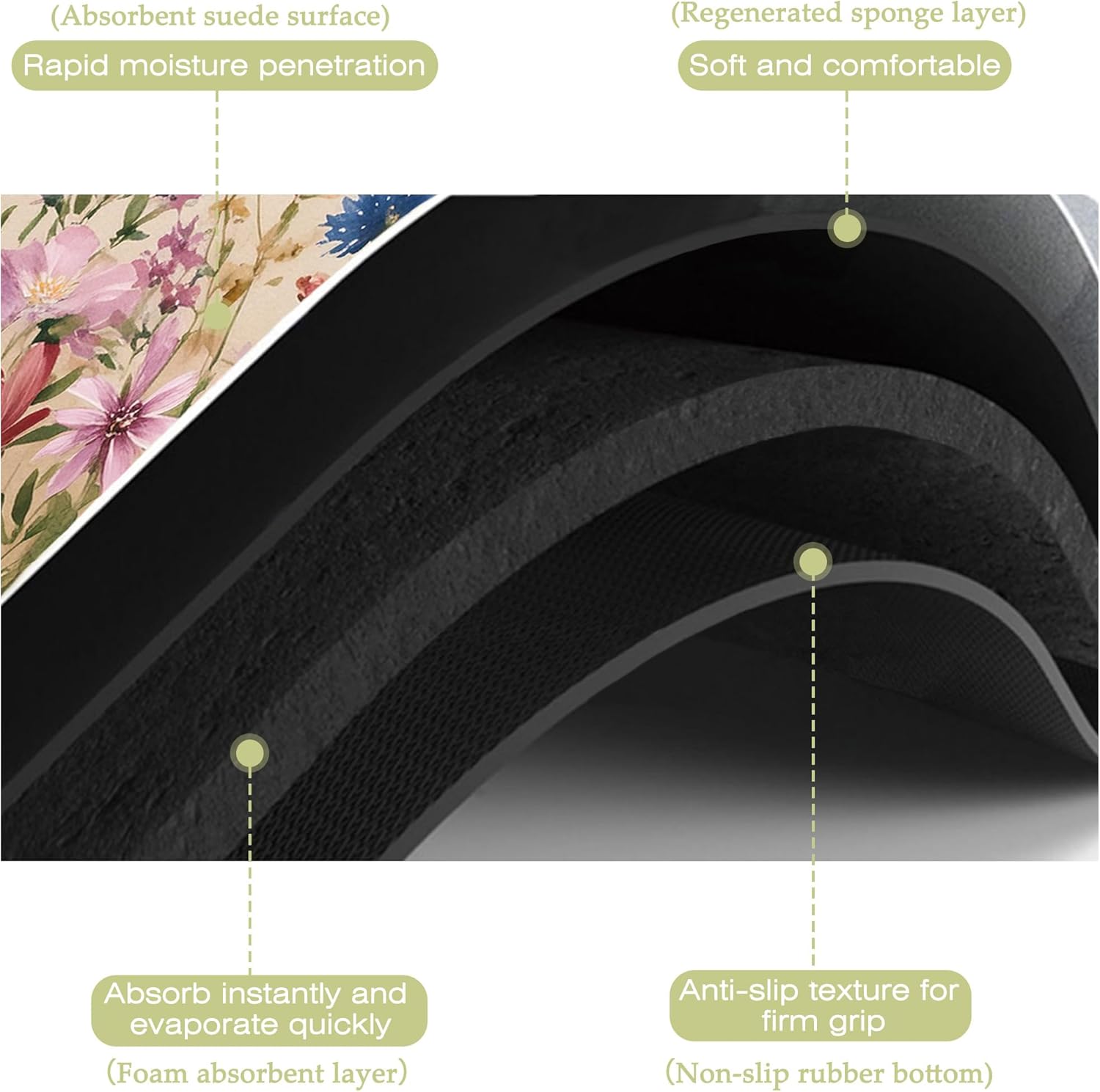 - Super absorbent and non-slip:This kitchen mat absorbent layer is made of absorbent suede and diatom mud,the surface porosity of the product is as high as 85%,which can quickly absorb water and stains,the texture design on the back is more non-slip