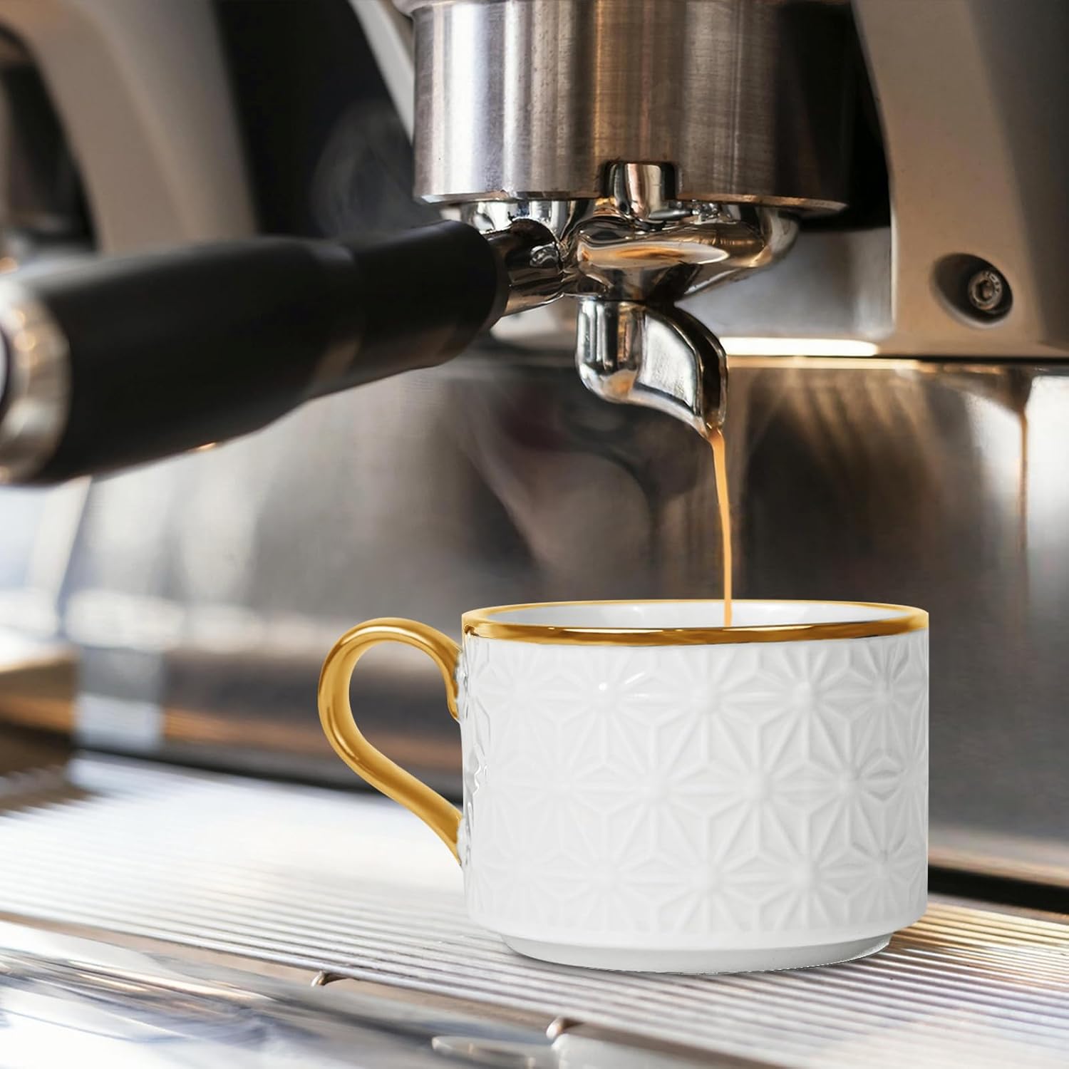 - Espresso Cups and Saucers Set of 6: Our stackable coffee cups set consists of 6 coffee cup and 6 saucers. The traditional coffee cup shape is paired with a unique plaid embossing, and the edge is embellished with gold to make the cup more delicate and suitable for your daily use in the home or office.