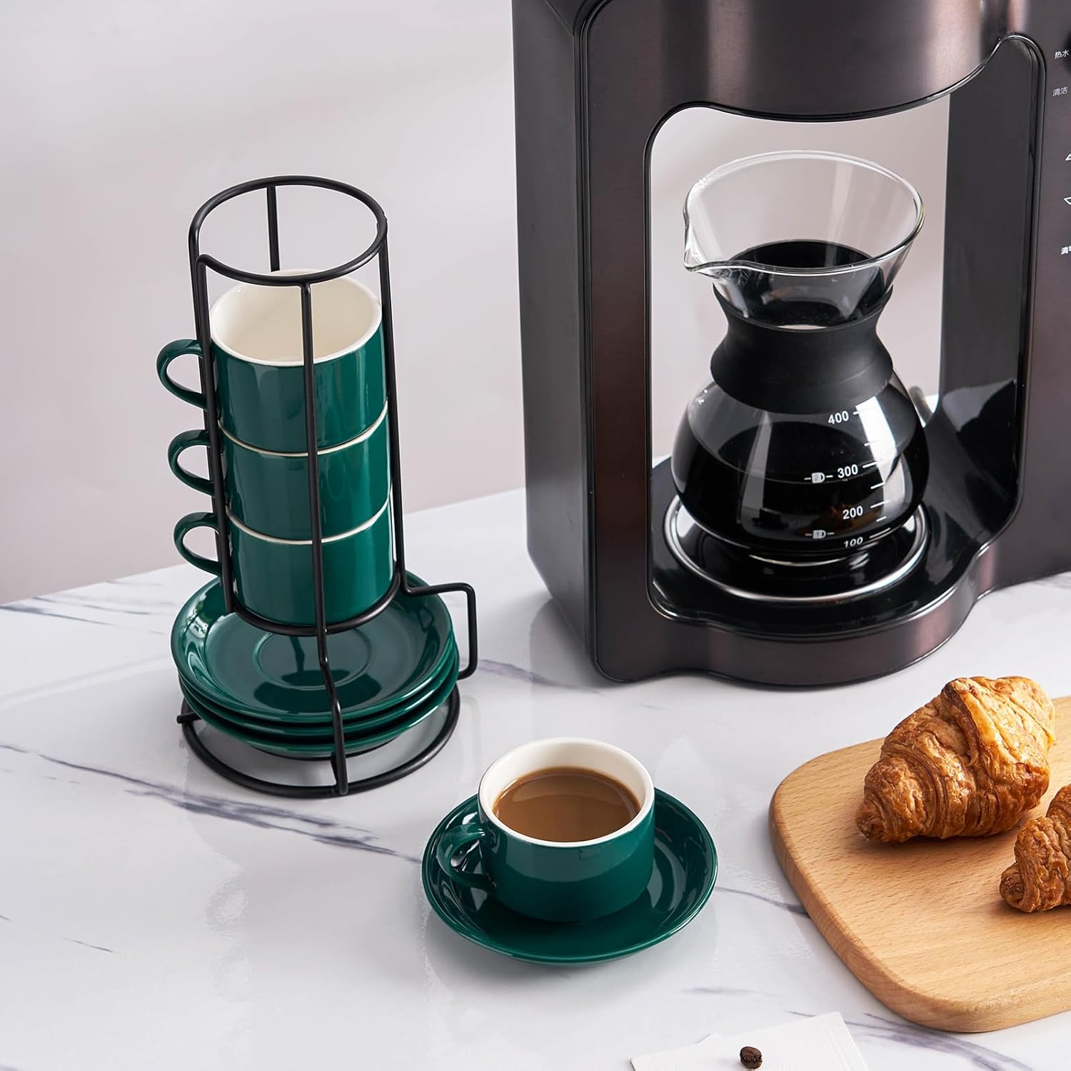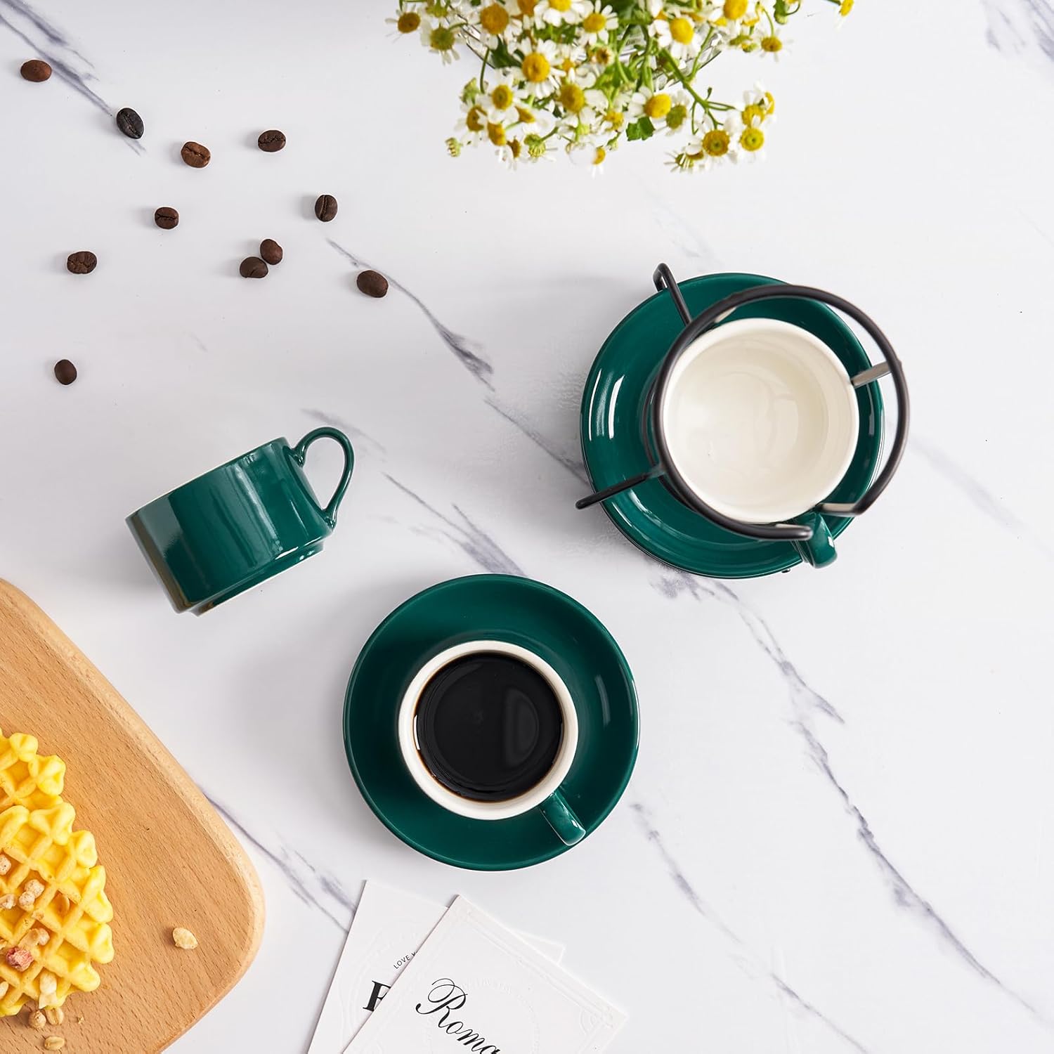 8oz Porcelain Stackable Cappuccino Cups with Saucers and Metal Stand Set of 4, Coffee Cups for Espresso, Specialty Coffee Drinks, Latte, Americano and Tea - Green