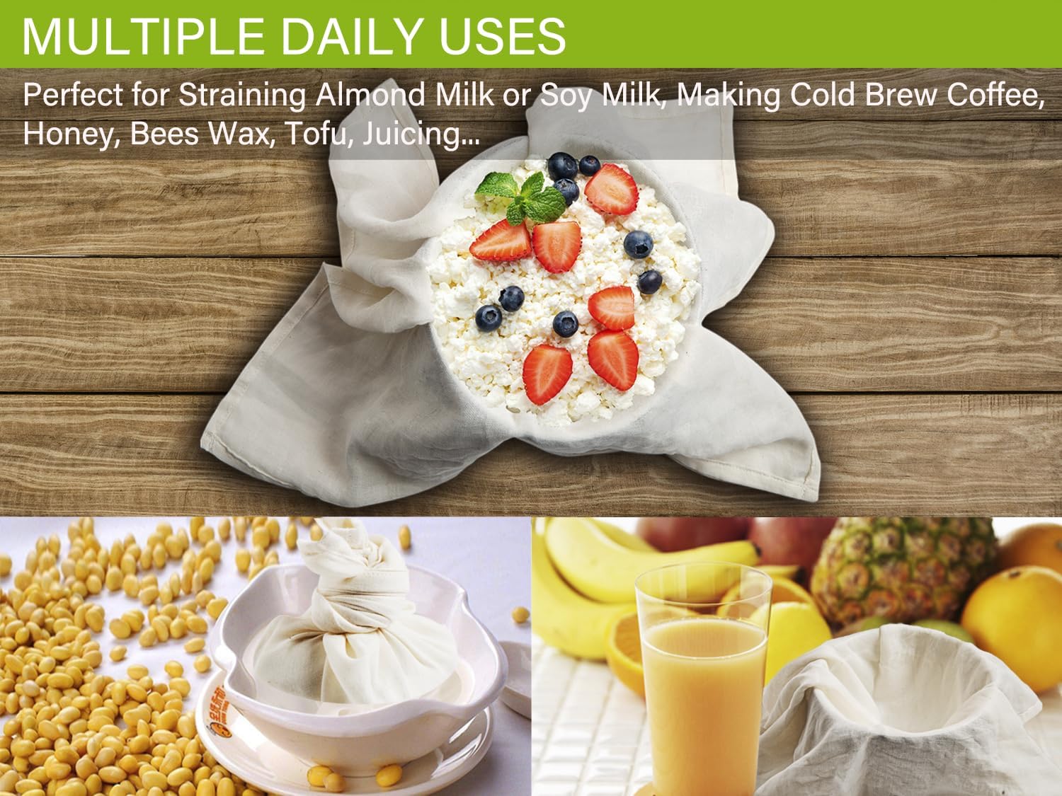 - Truly Chemical Free - Strain broth, baste turkey, make jams and fruit jelly, all without plastic. Unbleached Organic Cotton - Strain soy milk, cold brew coffee, juice, and any other foods without worrying.