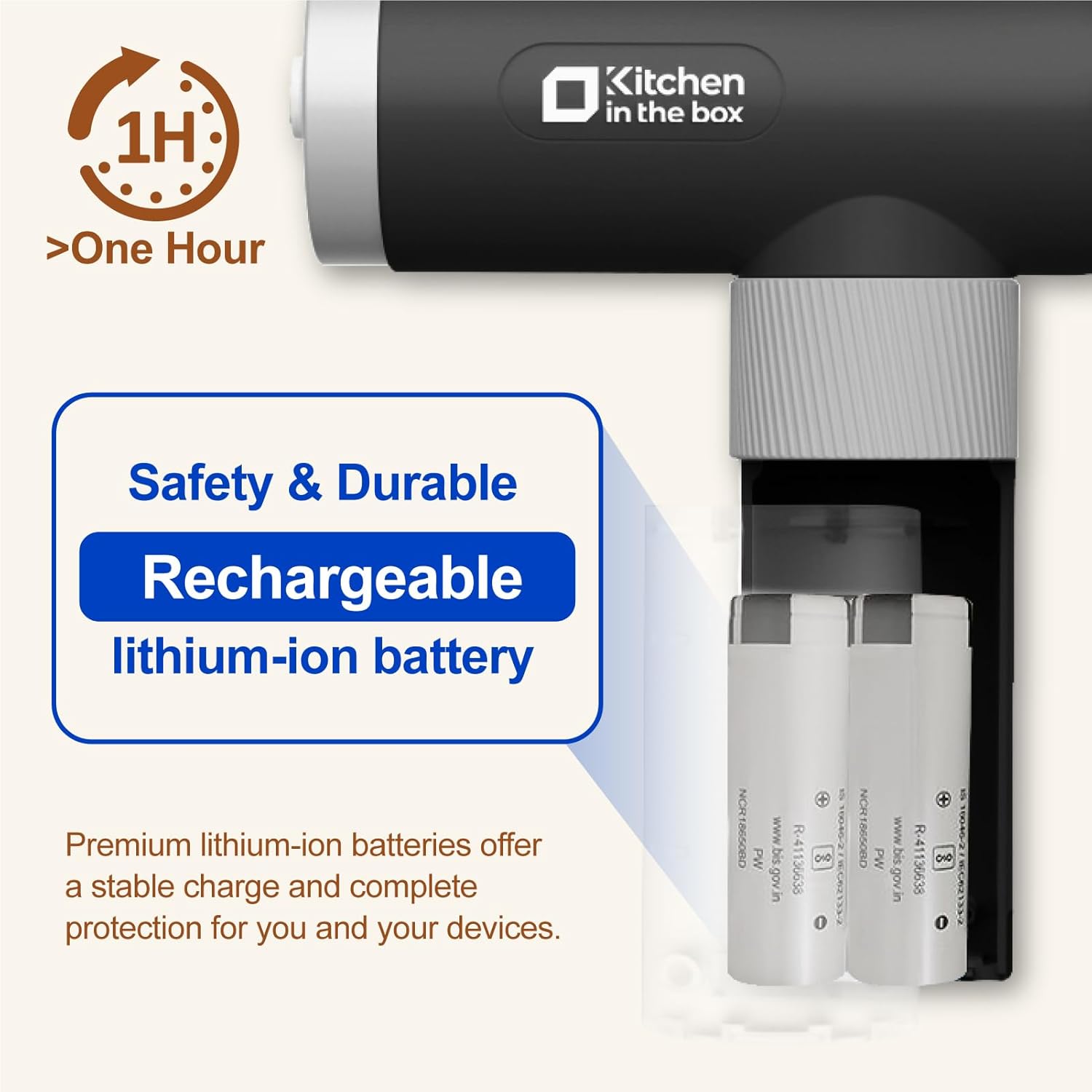 - Safe & Durable Battery - Our compact cordless mixer for baking equipped with high quality lithium-ion battery, providing stable charging and comprehensive protection for you and your device. Large-capacity battery can be used for more than 1 hour on a full charge