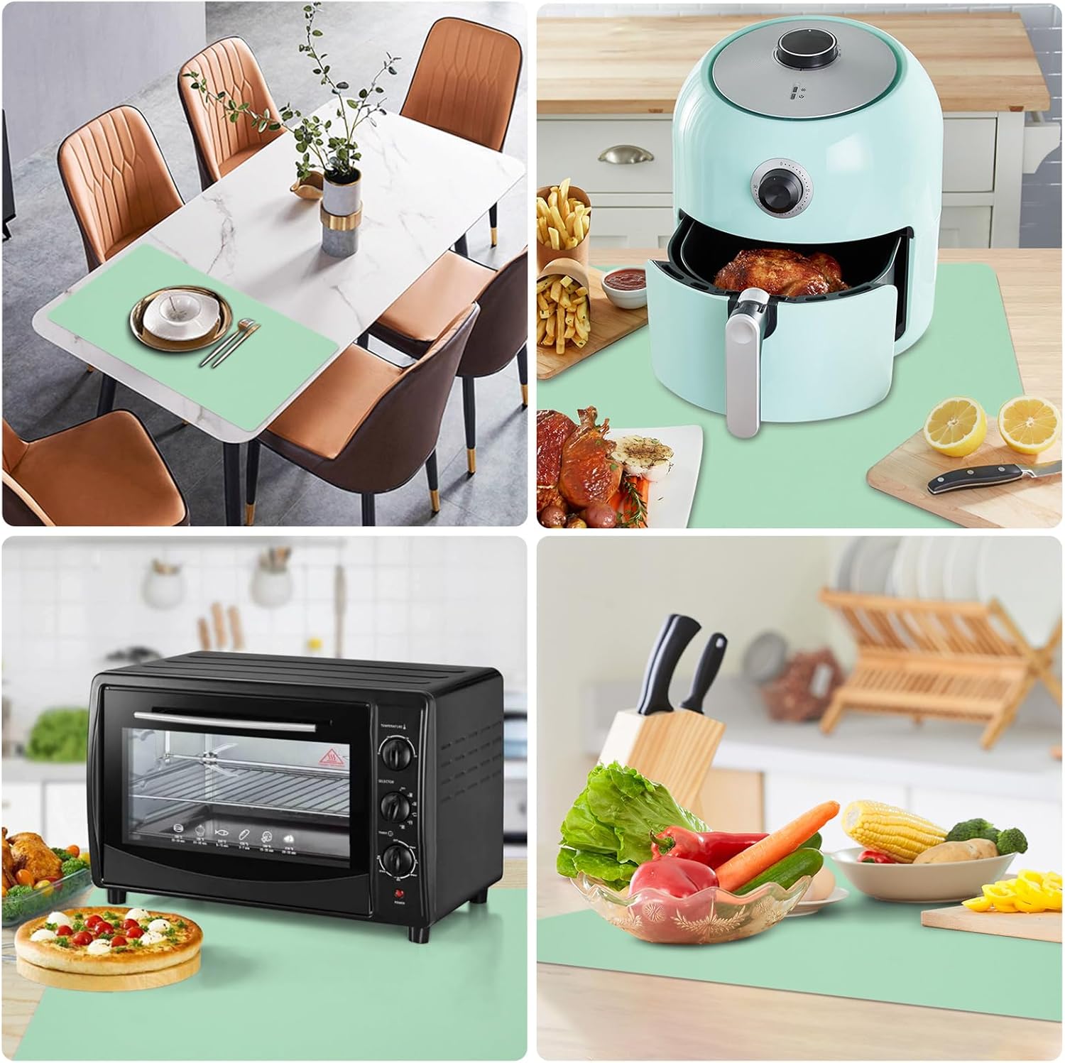 - Extra large silicone mat: Size of 48” x 24”, almost can fit most kitchen countertops, dining tables and other workbench. It can be placed under the air fryer, microwave, toaster oven, induction stove, coffee maker to protect the kitchen countertops and other surfaces against spills, scratches, grease, heat, etc. It’s cuttable to fit different sizes and shapes.