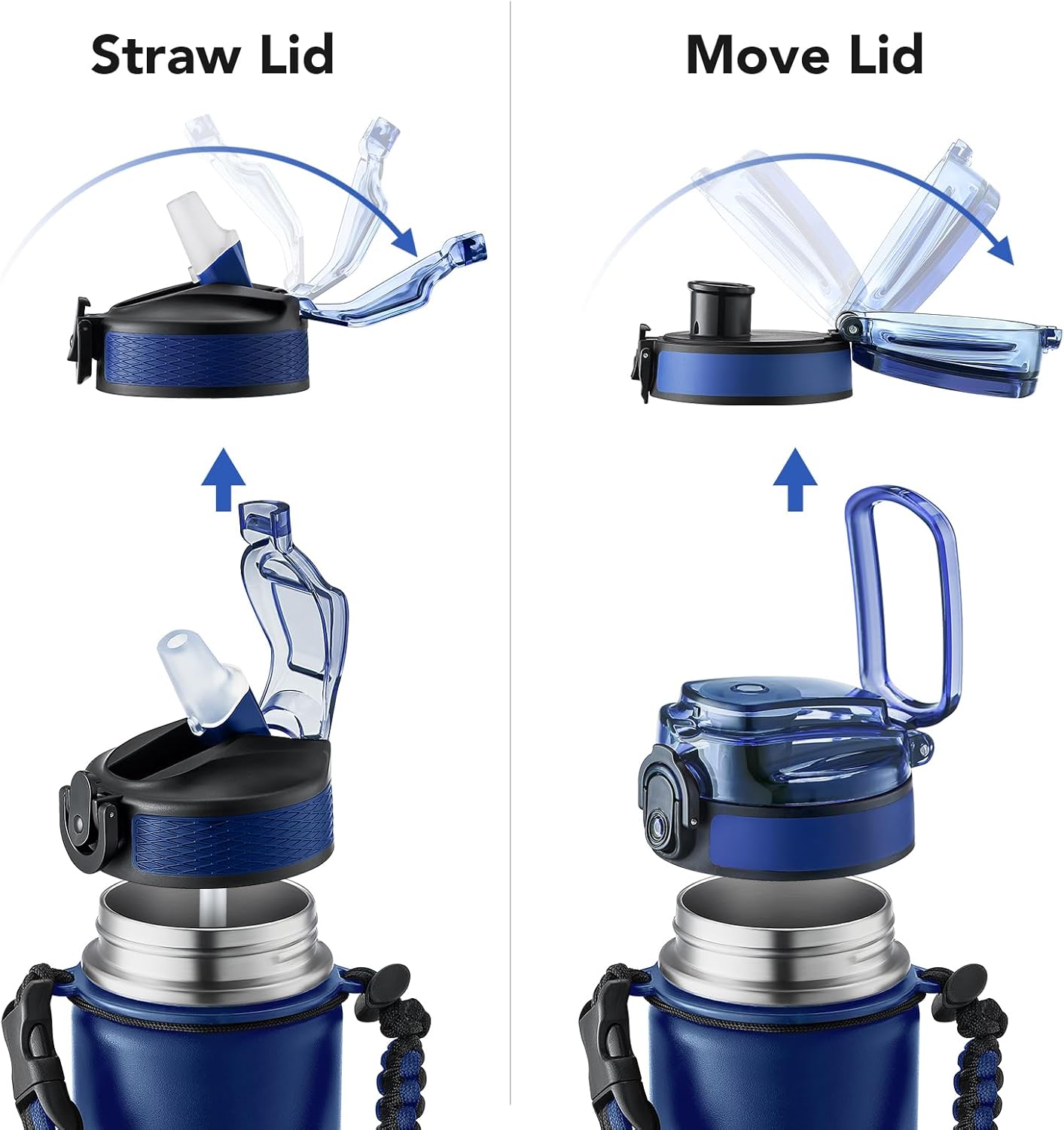 - Insulated water bottle 24 oz: 24 oz insulated water bottle has a matte finish and comes with 2 lids (Lid with Straw/No Straw) and a Paracord handle for easy portability; Its wide mouth makes it easy to fill, pour, and clean, and the leak-proof cap ensures worry transport.