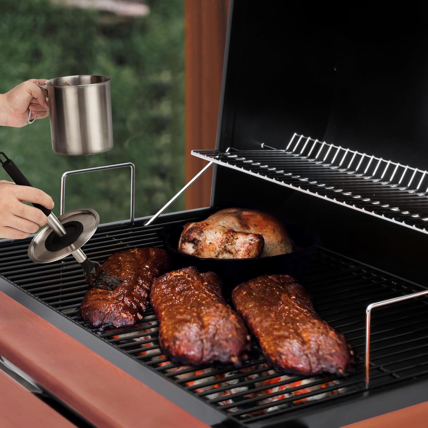 - Multiple Culinary Application: 37 oz large capacity basting pot allows you to avoid refilling sauces frequently, holds enough sauce to do a good size meal without wasting. Great for basting ribs, beef, chicken, turkey, smoked salmon and a large amount of meat, brushing pastry, pizza, cookies, grilling vegetables. Ideal for small table top grill and large grilling/smoking party. This is the best basting pot to have outside for when you use sauces on meat, make your outdoor cooking experiences more enjoyable.
