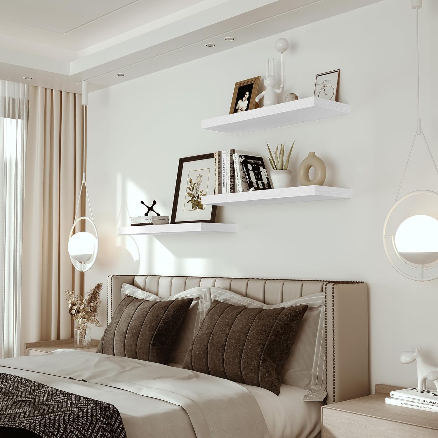 - Well-designed Floating Shelves - The rustic style floating shelves combining both practicality and style. These shelves offer a generous deeper and thicker surface, perfect for organizing daily sundries without taking up valuable floor space. The various of selected colours finish adds a cozy, natural element,display your art pieces on the wall to decorate your home, and make it full of aesthetic flare.