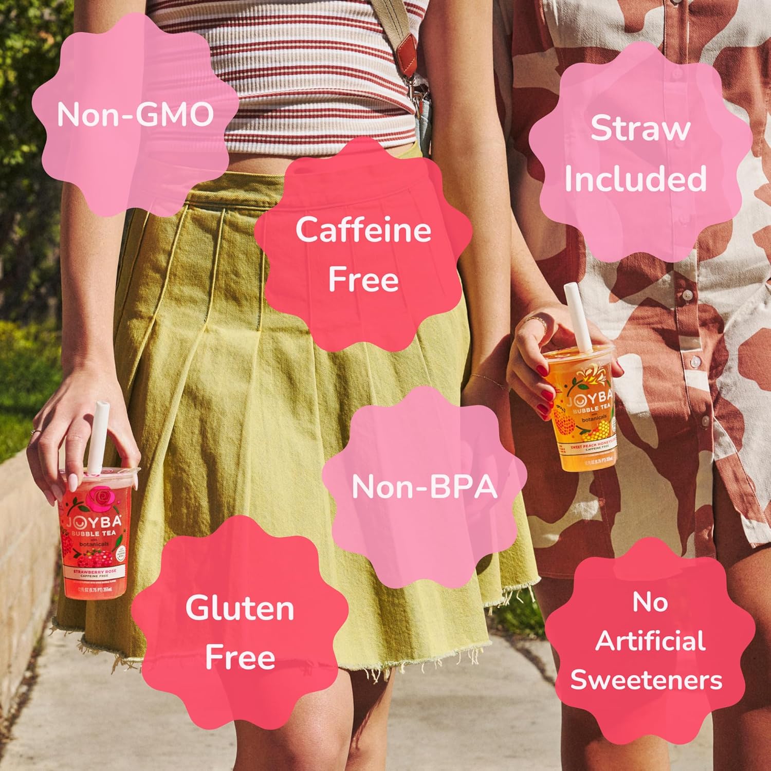- Joyba sweet peach flavor infused with honeysuckle botanicals into caffeine free tea with the perfect amount of popping boba.