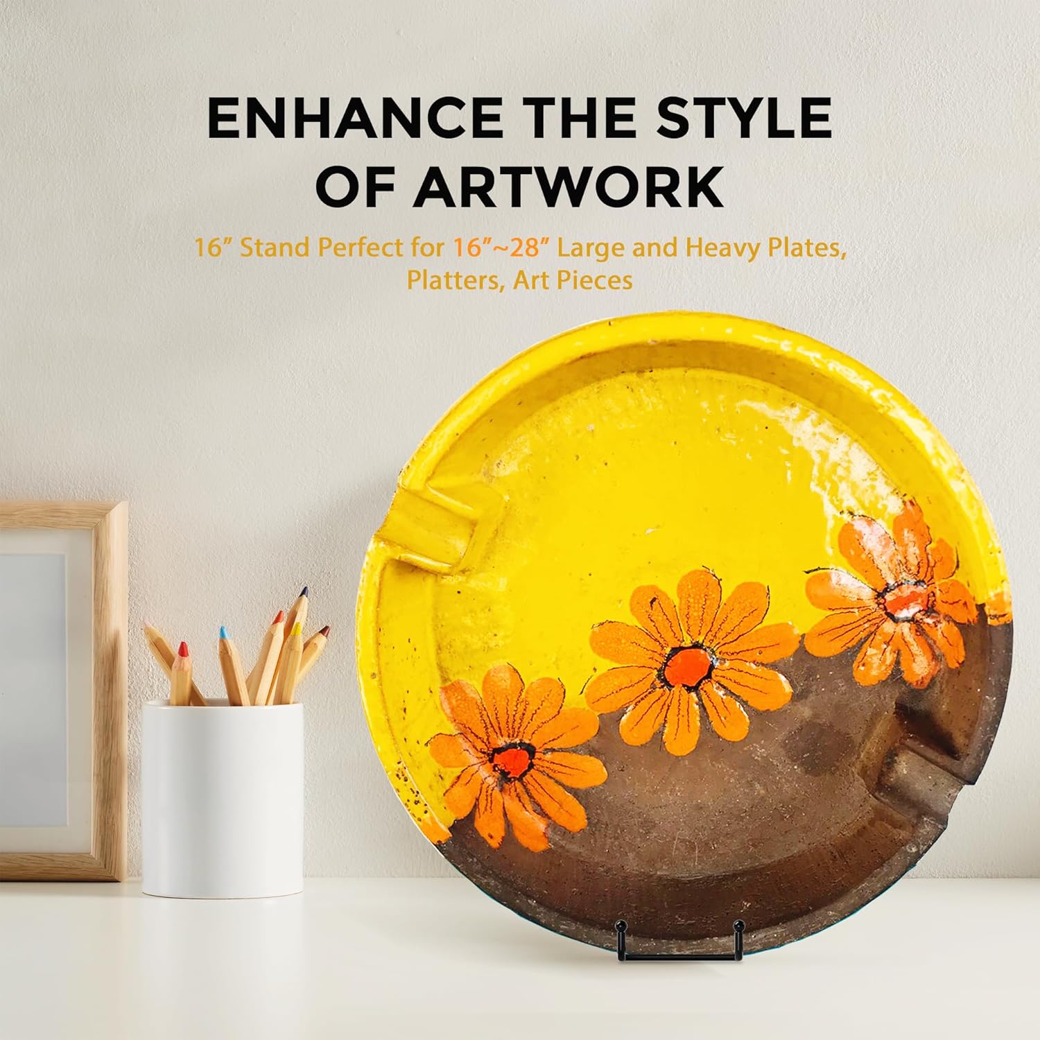 - Versatile 16-Inch Plate Holder: Designed with a 2.75-inch deep lip, 10° tilt angle, and a 5-inch wide base, this stand securely holds items from 16 to 36 inches tall and up to 25 lbs, making it perfect for large plates, decorative platters, posters, picture frames, and more
