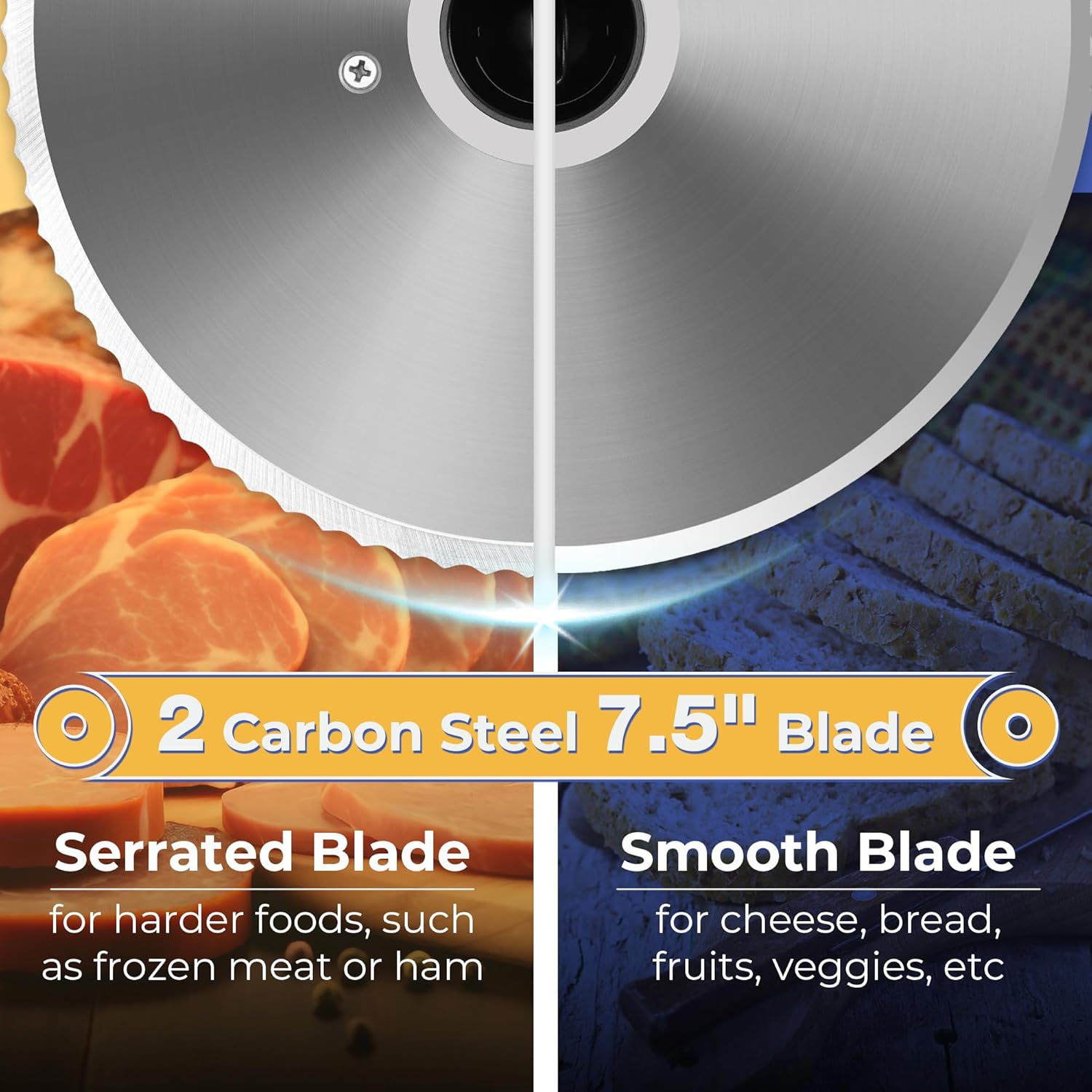 - 7.5-inch Blades- equipped with 2 different blades, a smooth blade can cut cheese, fruit, bread, etc., and a serrated blade can cut frozen meat, ham, potatoes, and other foods