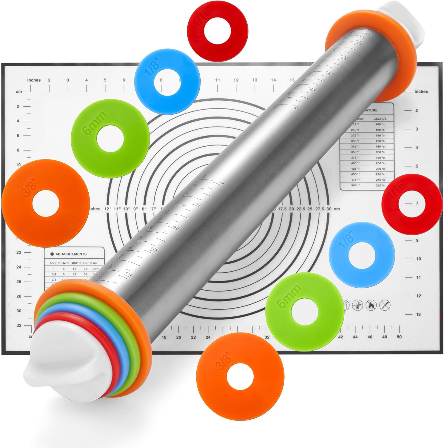 17" Stainless Steel Rolling Pin with 4 Adjustable Thickness Rings and Baking Mat for Dough, Pizza, Pies, Pastries, Pasta, Cookies (Black Mat)