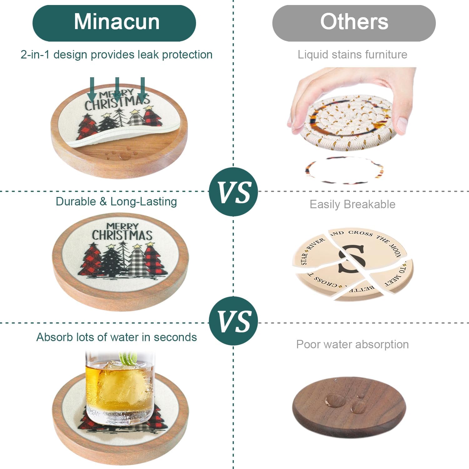 - 🎁Non-slip & Non-stick cups: Minacun Wooden coaster with 4 soft anti-slip pads on the bottom, which protect the surface of your furniture from scratches or damage, and prevent sliding all around; high-quality felt has good absorption that doesn't stick on the glass when you pick up the drink, prevents falling and noise, suitable for cold or hot drinks.