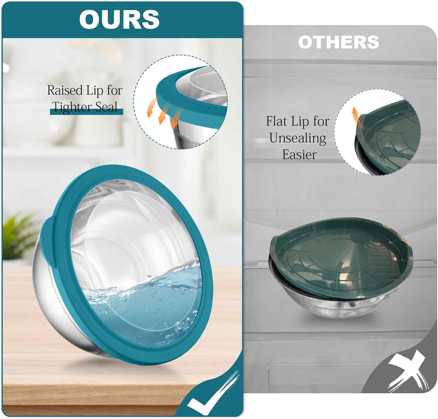 - PRACTICAL LIDS: These airtight lids with raised lip for sealing tightly, Helping keep the food fresh in the refrigerator for longer time and leak-proof, The lids with transparent design allow you to see the food inside the bowls and no need to open, Convenient for checking what’s stored, Arched design on one sides of the lid for easy opening and closing