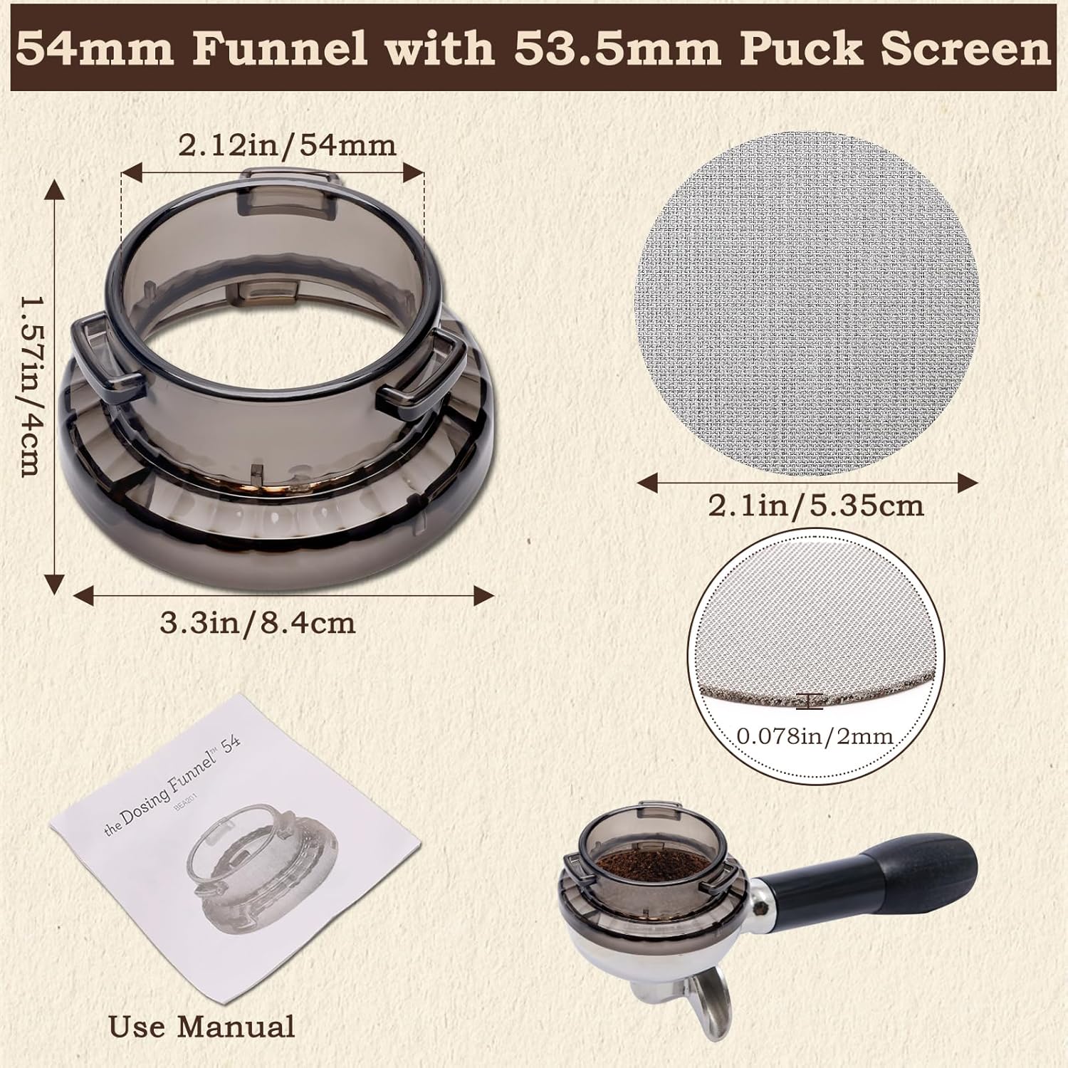 - 【Multiple Applications】54mm dosing funnel and 53.5mm puck screen are specially designed for Breville 54mm Portafilters, compatible with Barista Express (BES870XL), Barista Pro (BES878BSS) and Barista Touch (BES880BSS).