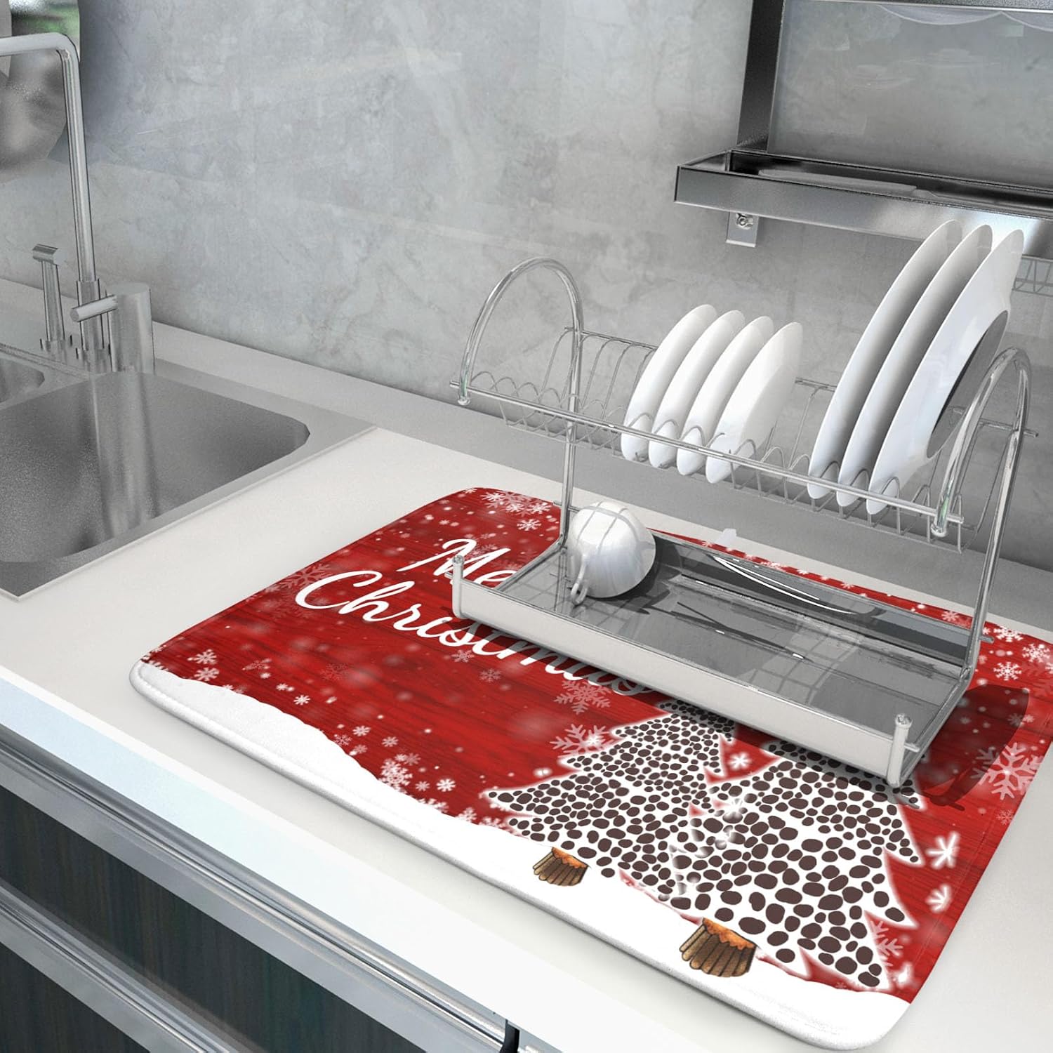 Merry Christmas Tree Red Dish Drying Mat for Kitchen Counter,Winter Snowflake Pine Drying Mat 18 x 24 Inch with Absorbent Reversible Microfiber Dish Drying Pad for Coffee Bar