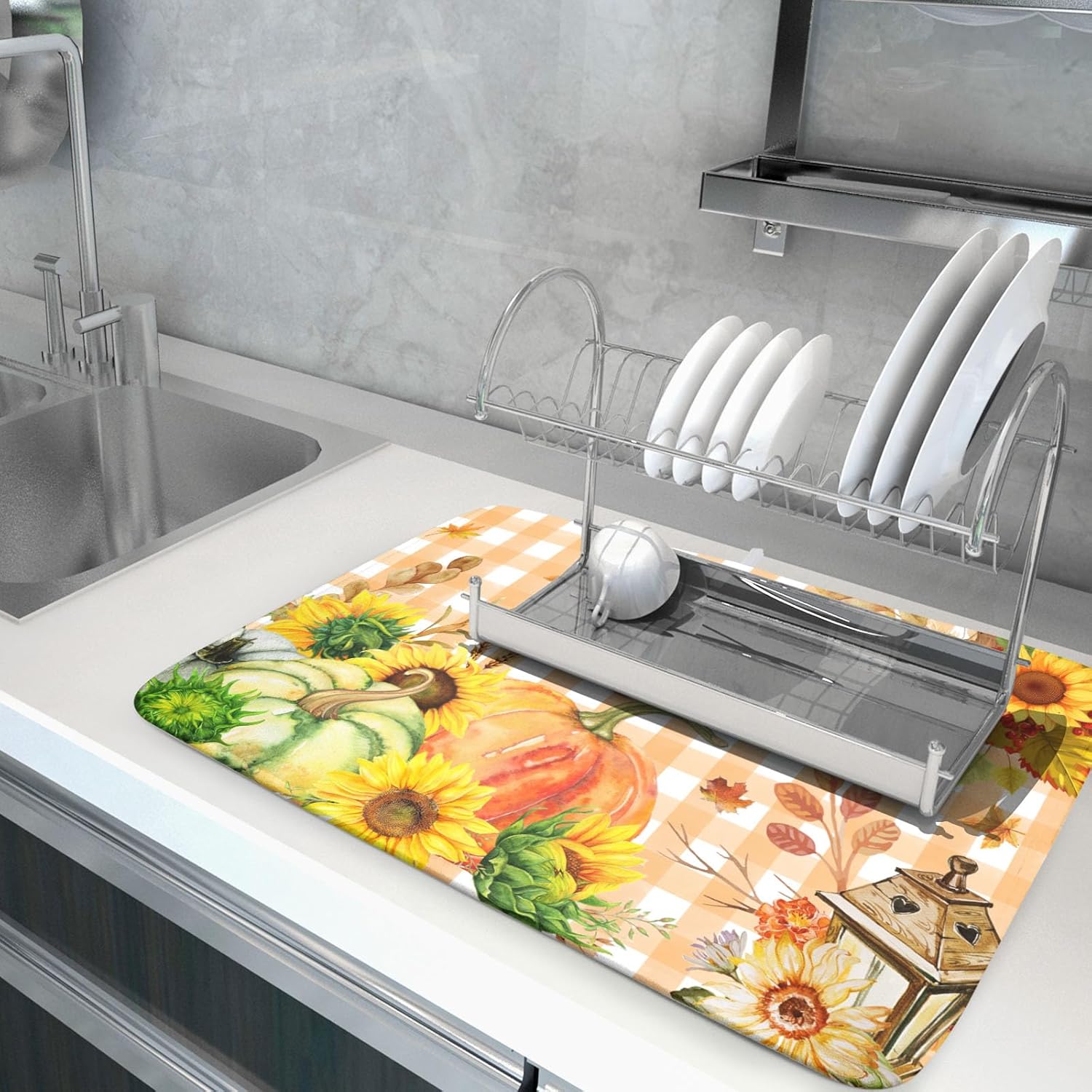 - 1【High Quality Material】:Our fall sunflower drying mat is made of high absorbent microfiber and the middle is made of composite spongedurable, reversible do not fade and comfortable. At the same time, it can protect your kitchen counter from scratching by the tableware.