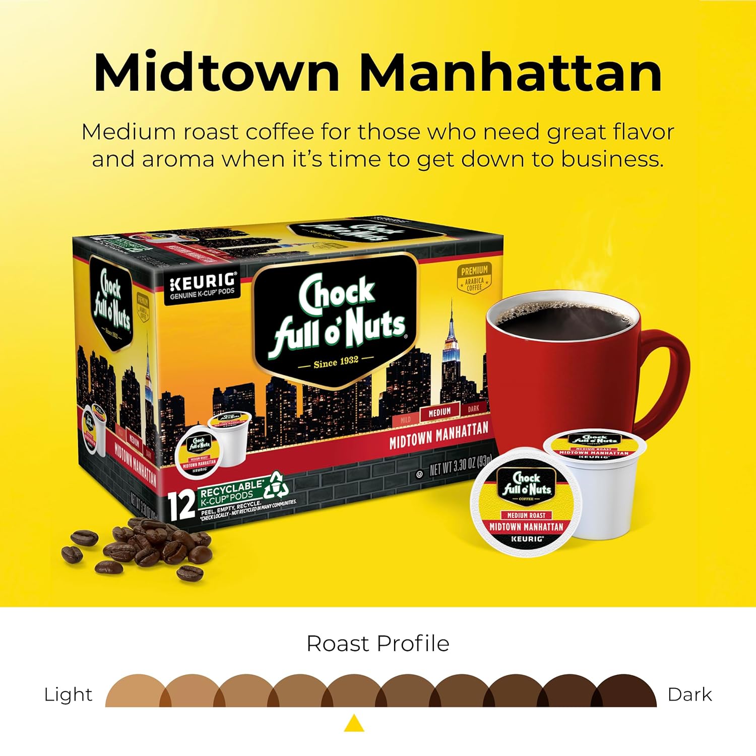 Chock full o’Nuts Midtown Manhattan Keurig K-Cup Pods for Keurig Brewers – Premium Arabica, Medium Roast – Single Serve – 1 Pack of 12 K-Cup Pods