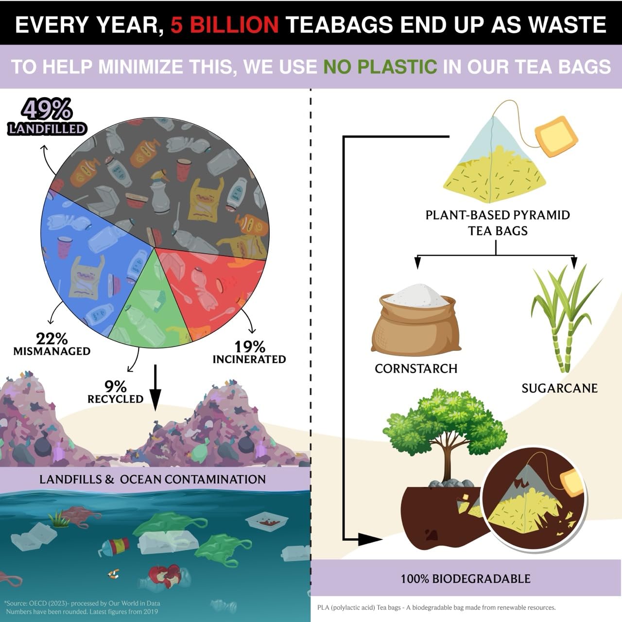- CONVENIENTLY PACKED - The tea comes packed in pyramid bags that allow for a more fuller and intense brew as it provides ample space for the tea leaves to unfurl and infuse. We have removed individual sachets from our packaging to reduce wastage, instead the pyramid bags are packed inside a resealable pouch that can be conveniently stored or carried as a travel tea.