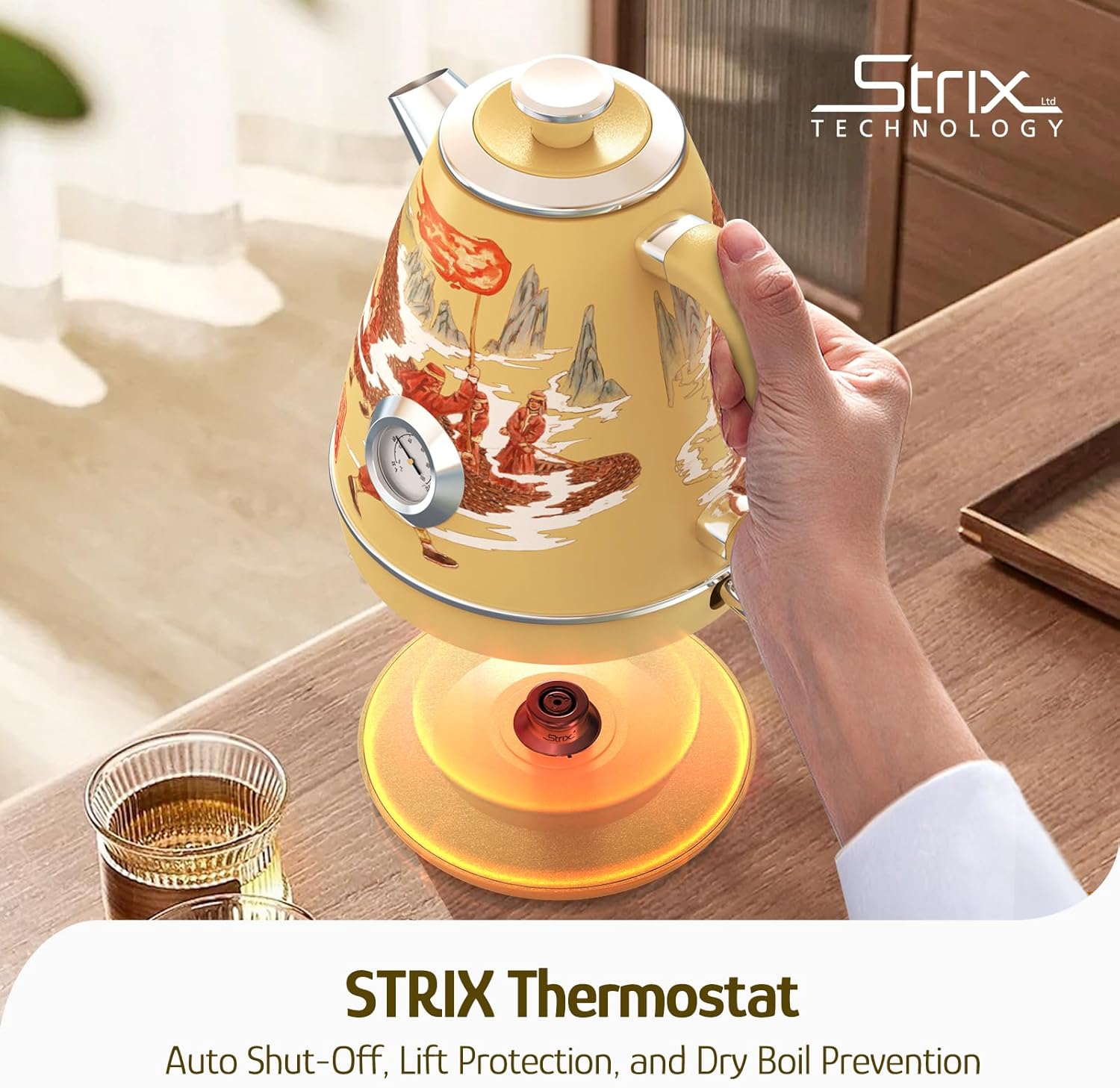 - Triple Security Guarantee: STRIX thermostat technology provides triple security for your use. Including 1-Auto shut-off when water begins to boil; 2-Auto shut-off when the kettle body is lifted from the base; 3-Prevent the kettle from turning on with no water inside.