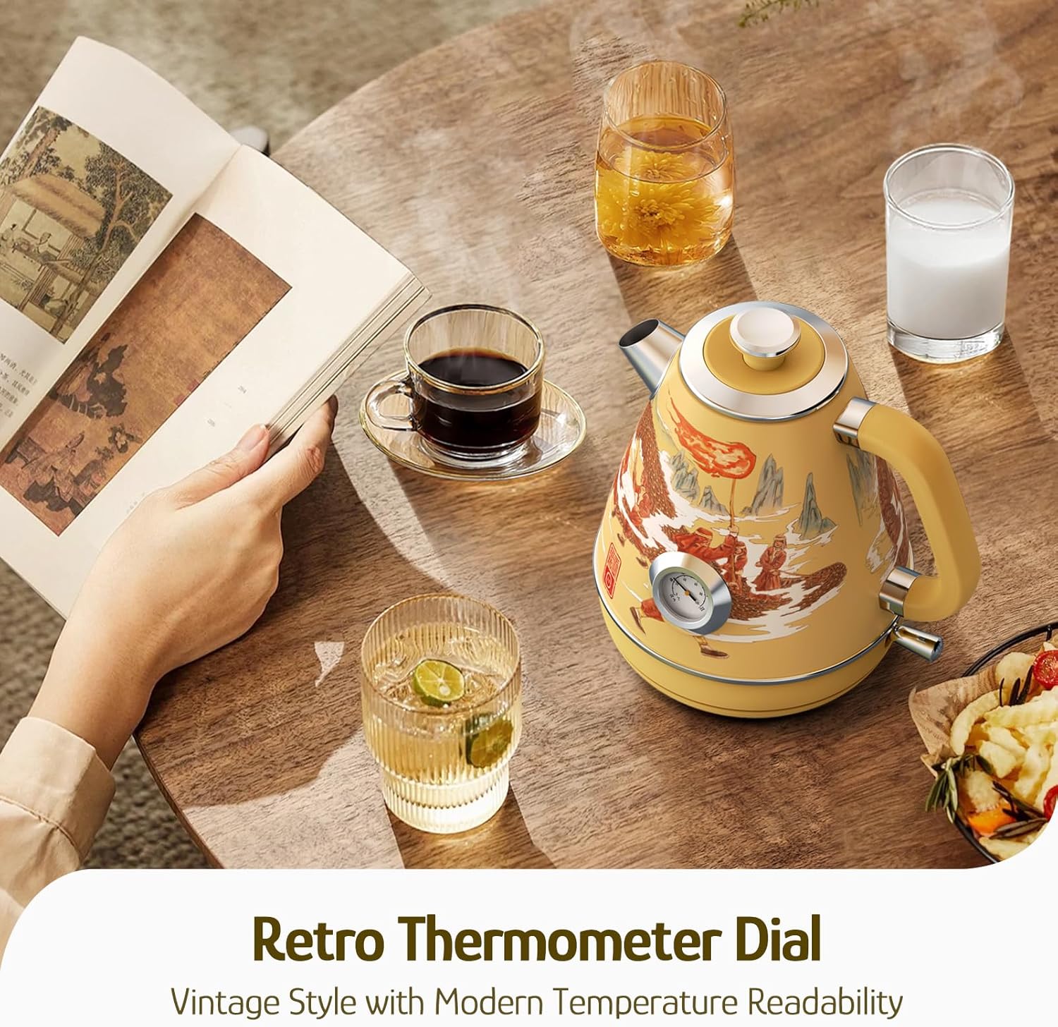 Hazel Quinn Retro Electric Kettle - 1.7 Liters / 57.5 Ounces Tea Kettle with Thermometer, All Stainless Steel, 1200 Watts Fast Boiling, BPA-free, Cordless, Automatic Shut Off - Dragon Dance