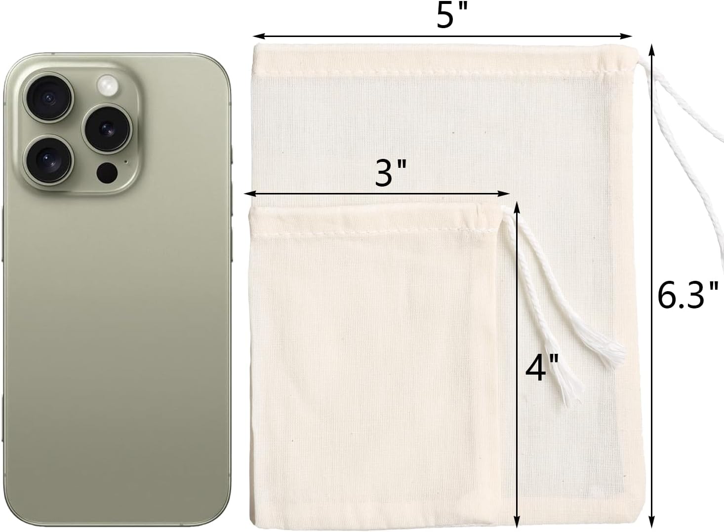 - Size for you to use: For tea : 2 x3inch/6*8cm, 3 x4inch/8*10cm, or 4 x6inch/10*15cm; for spice : 3x4inch/8*10cm, 4 x6inch/10*15cm; for cold brew coffee: 4 x6inch/10*15cm, 5 x6.3inch/13*16cm, 6*8inch/15*20cm ; bags for straining food: 7 x8inch/18*20cm, 8 x10inch/20*25cm. You could choose the sizes based on your need.