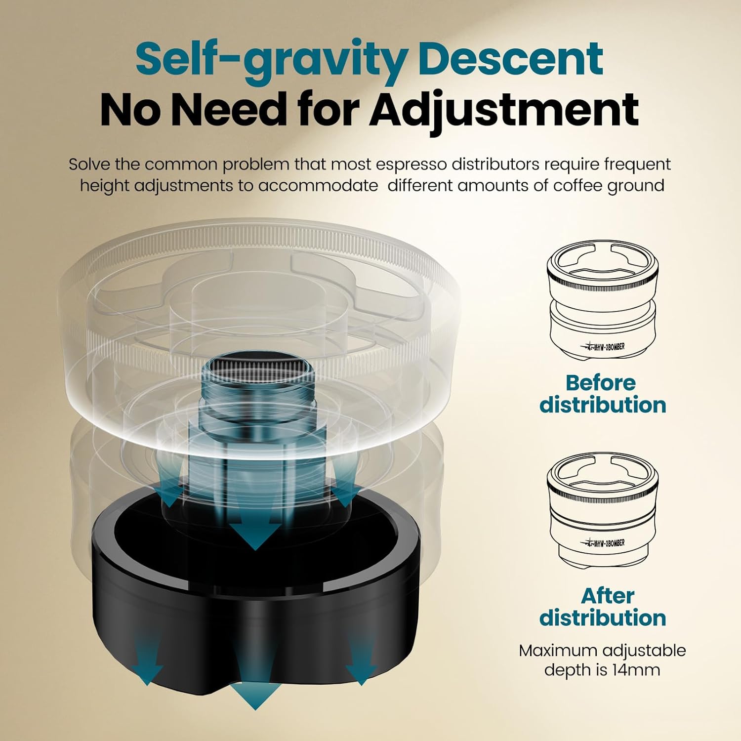 - 【Adaptive Gravity】This 53.3mm coffee leveler innovatively connects the base and top cover along a central axis, allowing for natural and uniform descent driven by gravity, facilitating even powder distribution. It resolves the common issue of frequent height adjustments required by most distributors for varying powder quantities. (Maximum leveling depth approximately 14mm)