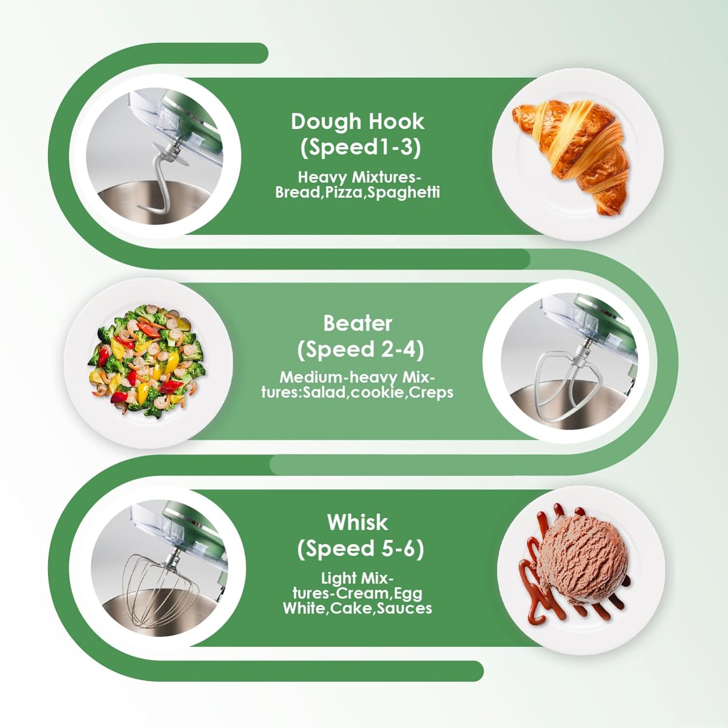 - Upgraded Accessories & Dishwasher Safe: This food mixer comes with a dough hook and flat beater made of aluminum with a protective layer, as well as a stainless steel whisk, all designed for easy use and high durability. The upgraded attachments are dishwasher-safe, allowing for quick and easy cleaning after use.