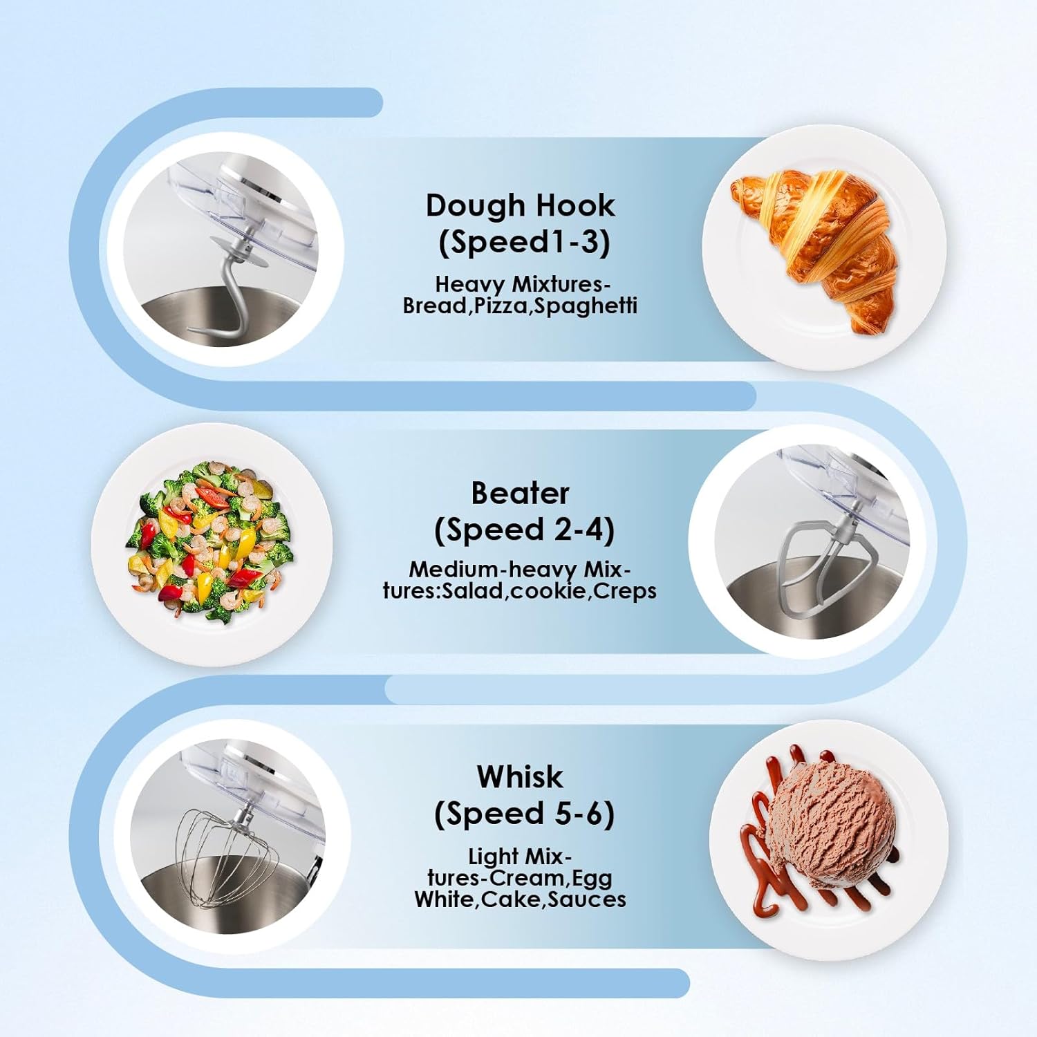 - 6 Speed, Easy to Use: This kitchen mixer features six adjustable speed settings and easy operation to meet your diverse mixing needs. The tilt-head feature allows for effortless switching between bowls and attachments.Its intuitive design ensures ease of use, making it ideal for both beginners and experienced bakers, delivering reliable performance for baking tasks.