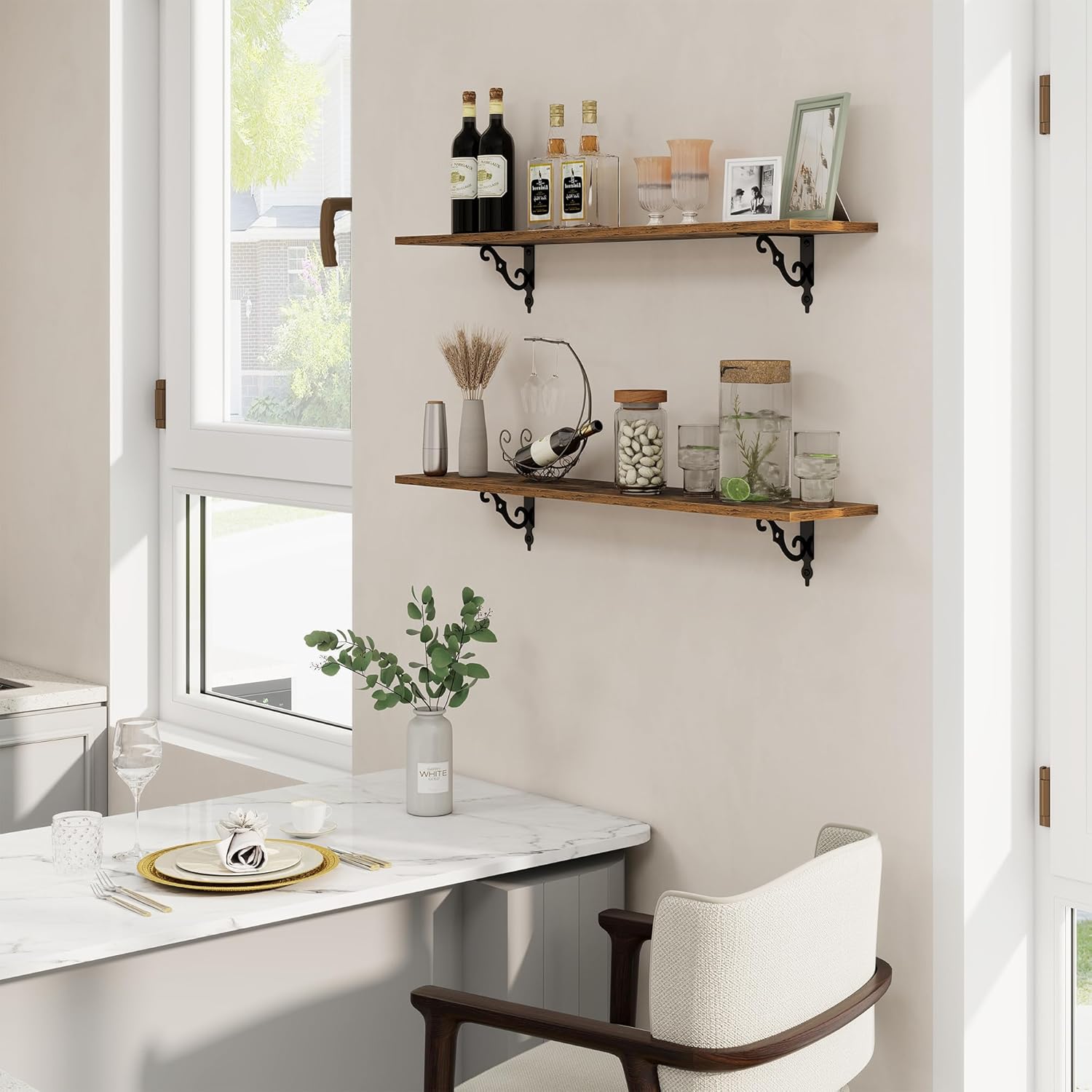 - Perfect Home Decor: This wood shelf fits rustic style, or vintage style home decor, rustic wood grain and exquisite S-shaped brackets will make your home full of modern and elegant romance. Our floating shelf makes full use of the wall, and let your room and bathroom look so cute
