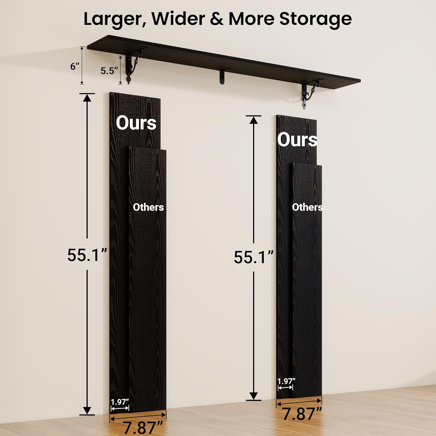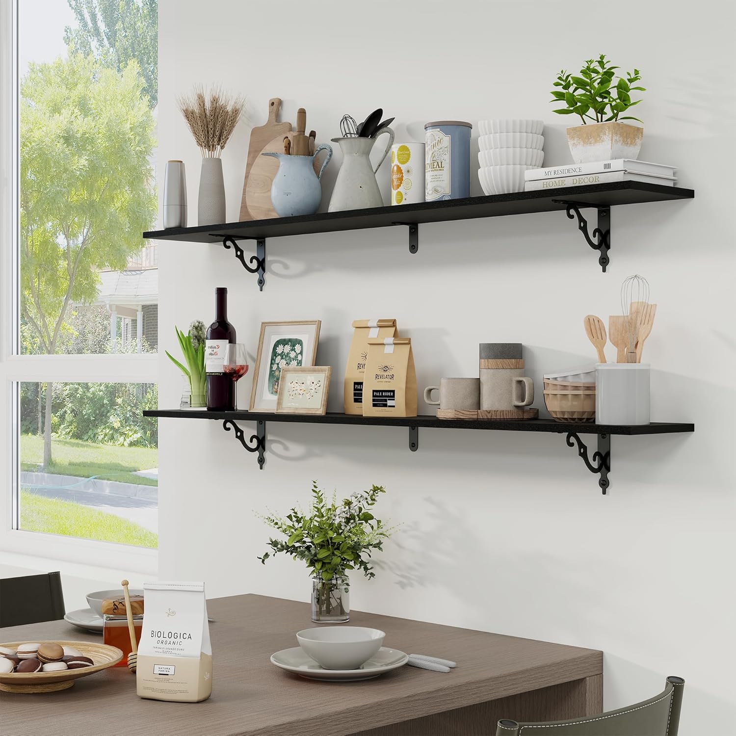 - Well-designed Floating Shelves: Our rustic deep floating shelves are made of high-quality particle board and sturdy brackets. The classic S-shaped metal brackets are designed to prevent sagging and ensure long-lasting stability. All edges are carefully sanded for a smooth finish