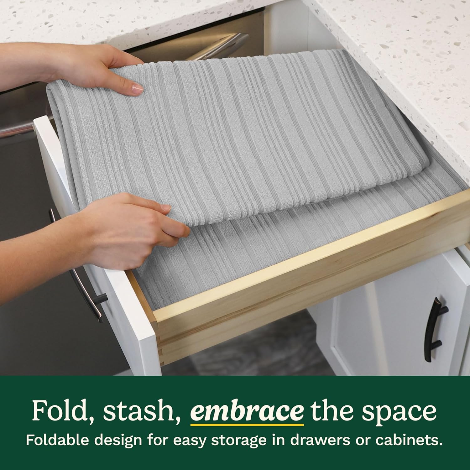 - SLEEK DESIGN, EASY STORAGE – Foldable for easy storage in drawers or cabinets, with a hanging loop for convenient alternative storage. These 18” x 24” xl dish drying mats come in stylish patterns, making them the perfect kitchen accessories for countertops while saving space at the same time.