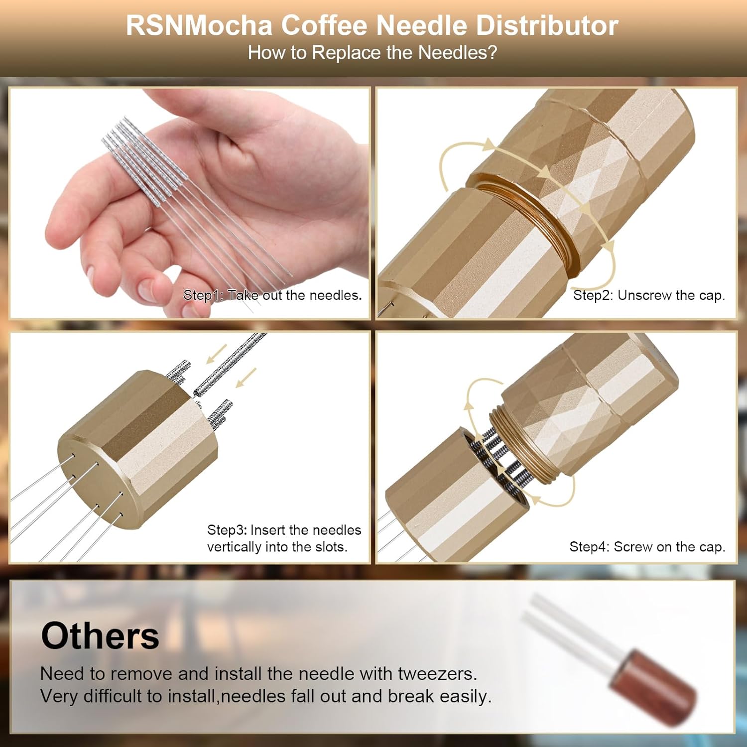 - 【DIY Needles】This coffee needle distributor package contains 12 x Φ0.25mm stainless steel needles, 6 are already installed and 6 for spare use. RSNMocha espresso accessories can be easily assemble/disassemble,it is convenient for comprehensive cleaning.