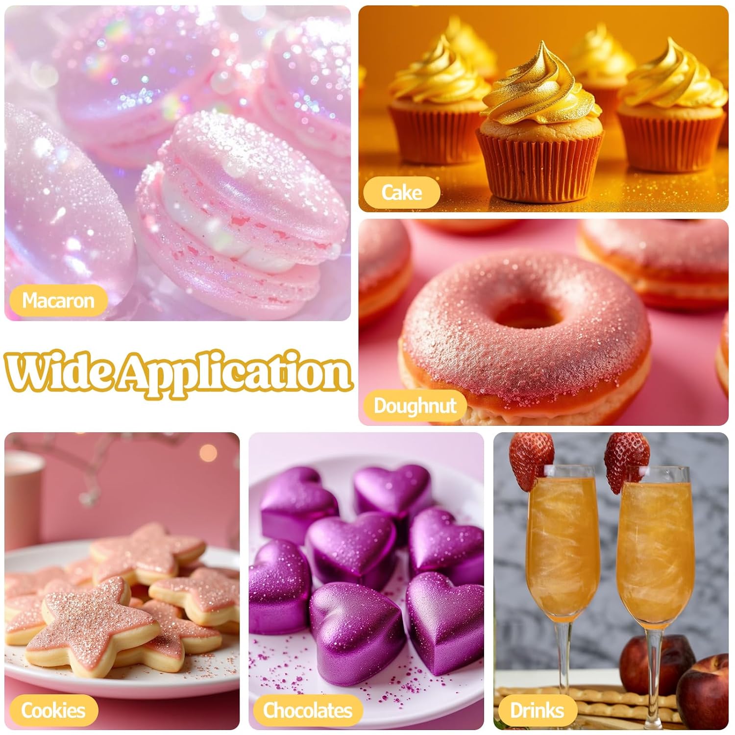 - Widely Used - This edible glitter is perfect for DIY wine, cocktails, champagne, drinks, beer, soda and more. it also can be sprinkled directly on the food, used to decorate cakes, cookies, chocolates, macarons, fruit platters, cupcakes, strawberries, lollipops, ice cream and more. It is also a great decoration for christmas, easter, halloween, thanksgiving, birthdays or any memorable holiday