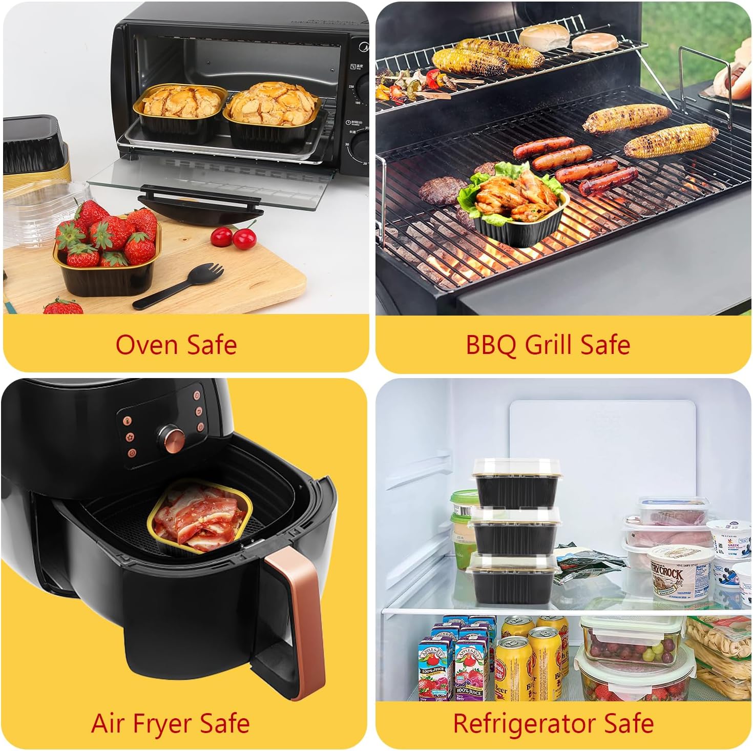 - 【No Baking Tray Needed】-These disposable mini pans are made of thicken food-grade aluminum foil,can stand well in oven.The mini cake tins are oven ,BBQ grill and air fryer safe.These mini aluminum baking pans can withstand temperatures up to 250℃/482℉,please allow cups to cool prior to applying lids. (NOTE:The clear lids are not heat resistant!)
