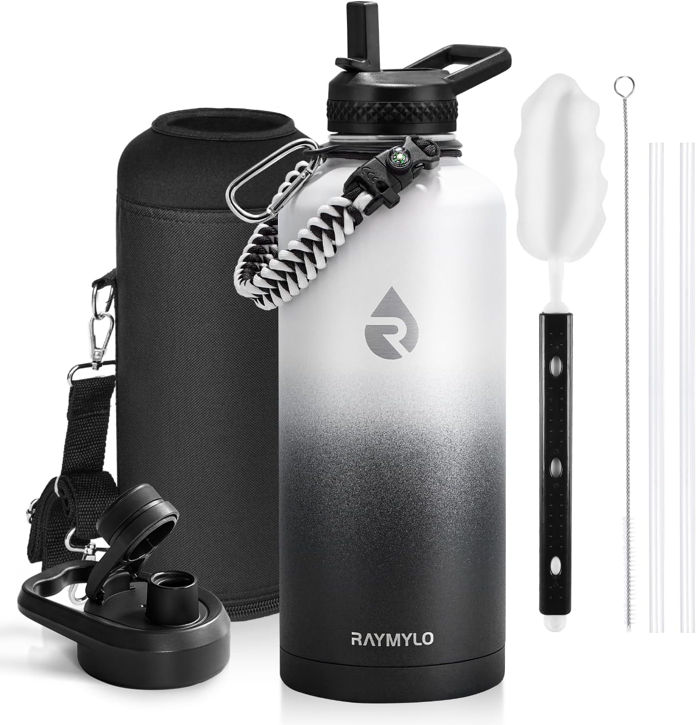- What You'll Get: We offer Continuous After-sales Service and 100% customer satisfaction against any leakage or insulation failure. You purchase contains: RAYMYLO 87oz Water Bottle, Carrying Pouch, Straw Lid with 2 Straws & Straw Brush, Spout Lid, Paracord Handle, Bottle Brush