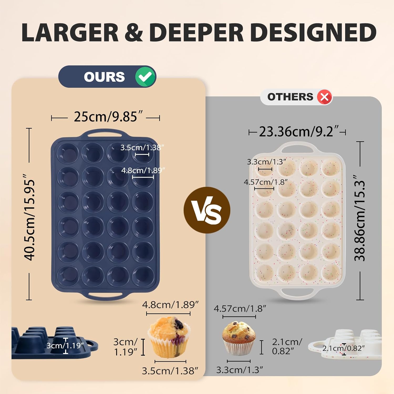 - Thick Design & Durable: Food grade silicone muffin pan uses a thickened design to ensure even baking and retain their original shape after repeated use. Maximum baking temperature is 450 degrees Fahrenheit. Silicon cupcake pans are perfect for baking egg bites, cake, eggs and so on.