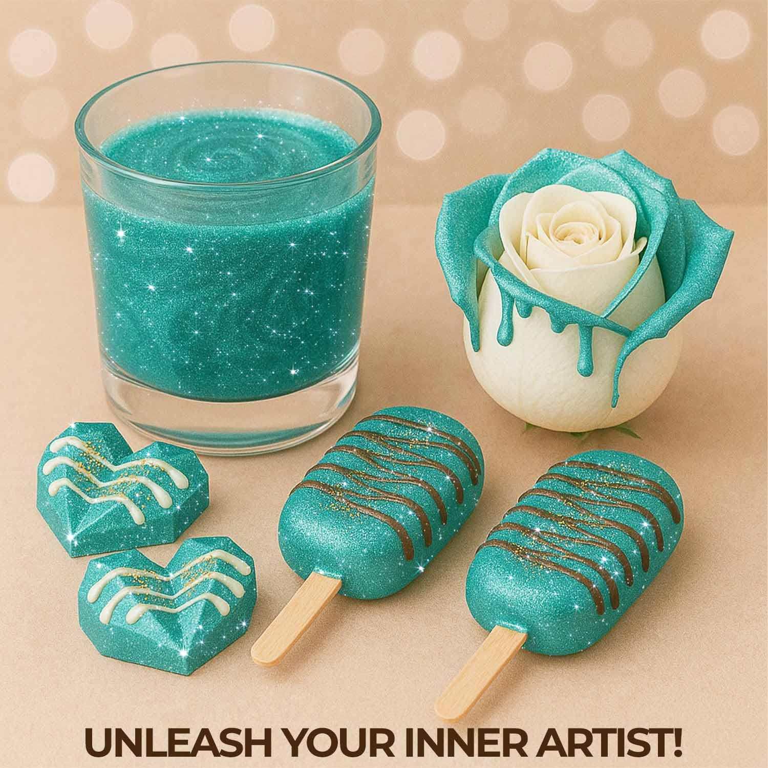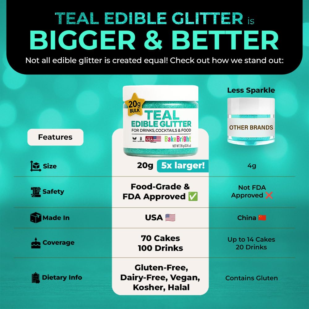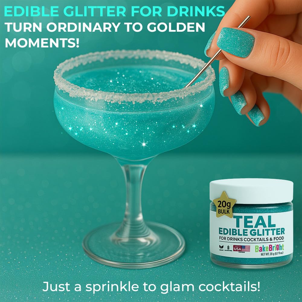 - 𝗘𝗗𝗜𝗕𝗟𝗘 𝗚𝗟𝗜𝗧𝗧𝗘𝗥 𝗙𝗢𝗥 𝗗𝗥𝗜𝗡𝗞𝗦 Glam up your desserts with edible glitter for cakes or bring sparkle to drinks using our edible glitter for cocktails. Our teal glitter is made from premium, food-safe ingredients including tasteless edible and teal. This teal edible glitter is the perfect finishing touch for baking, drinks, and all your cake decorating needs—guaranteed to wow at any event.