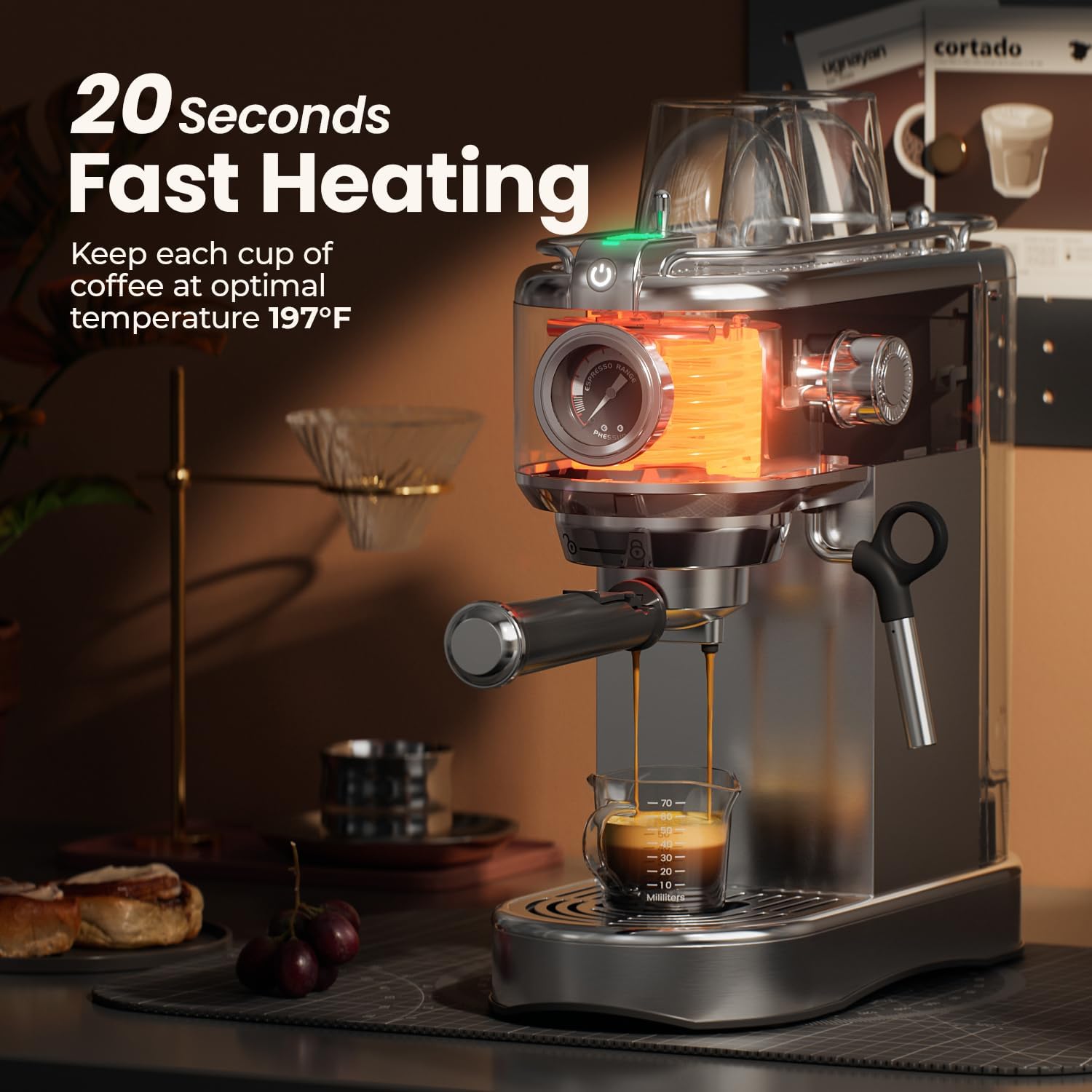 - 20 Bar Pressure Pump: You can enjoy barista pro-style espresso in your home or office, with the best taste smooth under 1450W power boiler. The built-in pressure gauge on espresso machine shows the exact pressure helping you make adjustments according to your personal taste preferences. You can create a cup of cappuccino, latte or flat white with our espresso maker.