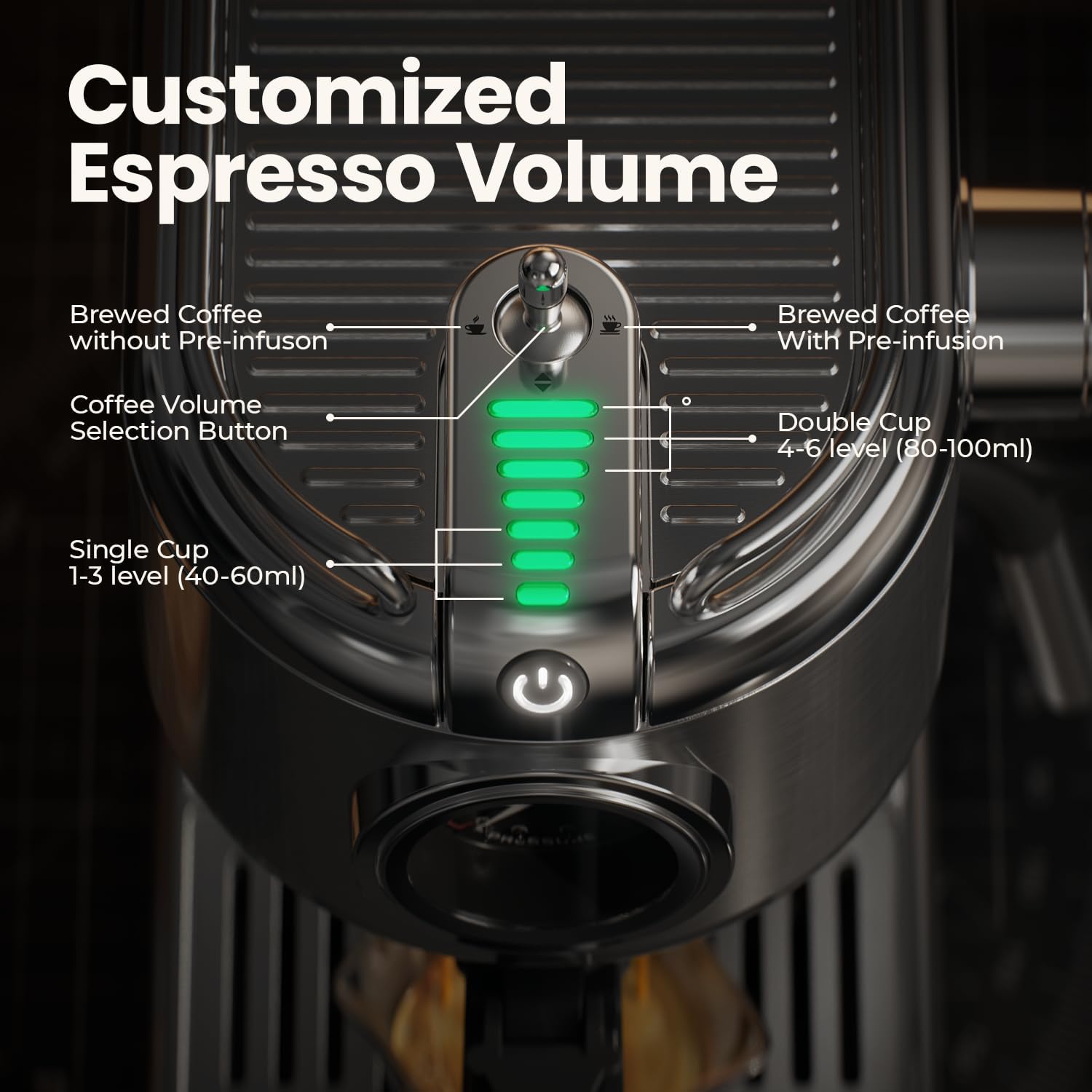 - Brew As Pro-barista: Our coffee maker utilizes a powerful high-pressure pump and uniformly moist pre-infusion technology to ensure that the coffee cream is fully extracted. Before the actual brewing, pre-moistening thecoffee grounds helps to fully extract the aroma and yield more oils.