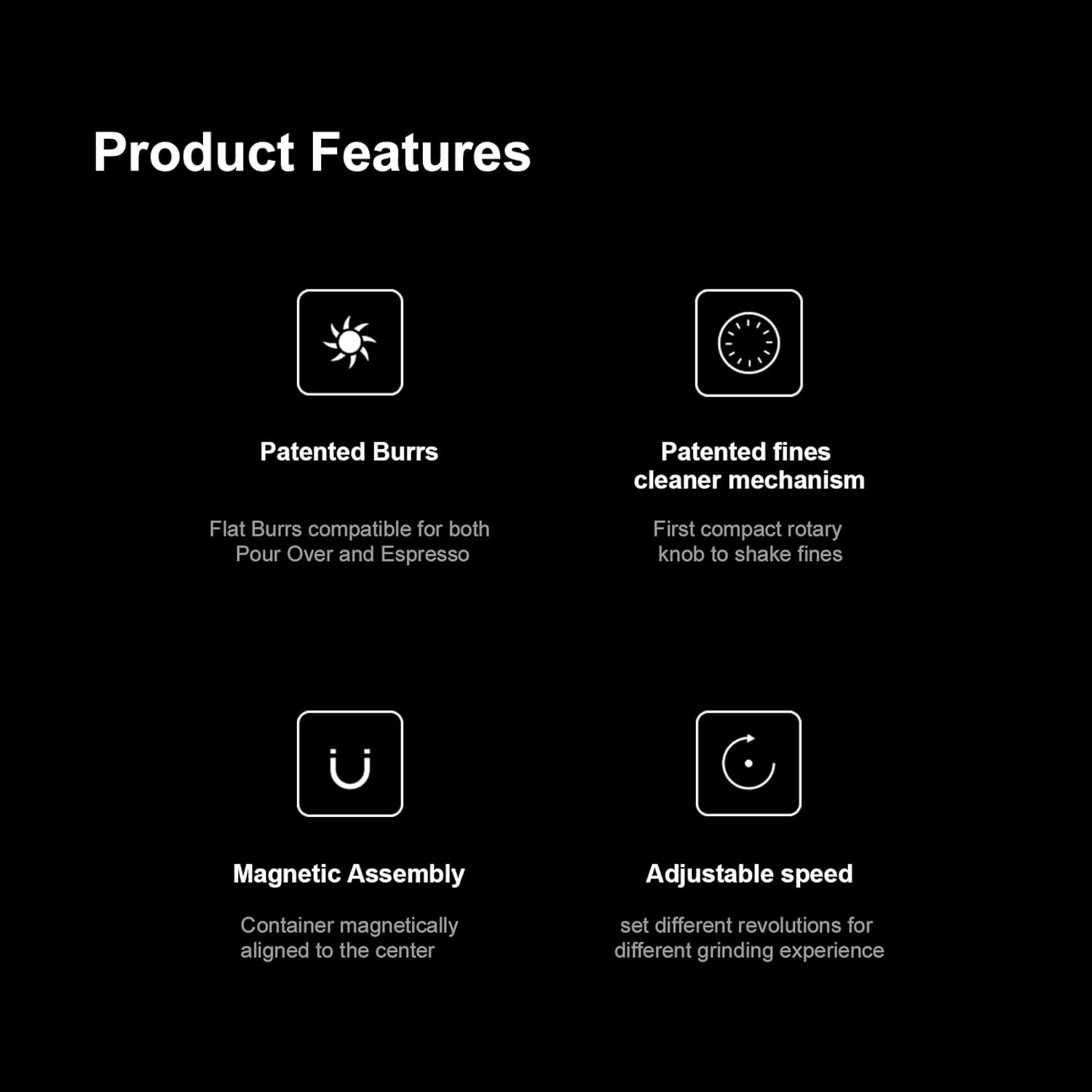 - [ Adjustable 800-1400 RPM ] Fine-tune your brew, and achieve your desired flavor withadiustable RPM. lt's available to set different revolutions togive you different grinding styles so you can have a varietyof operations according to your preferences.