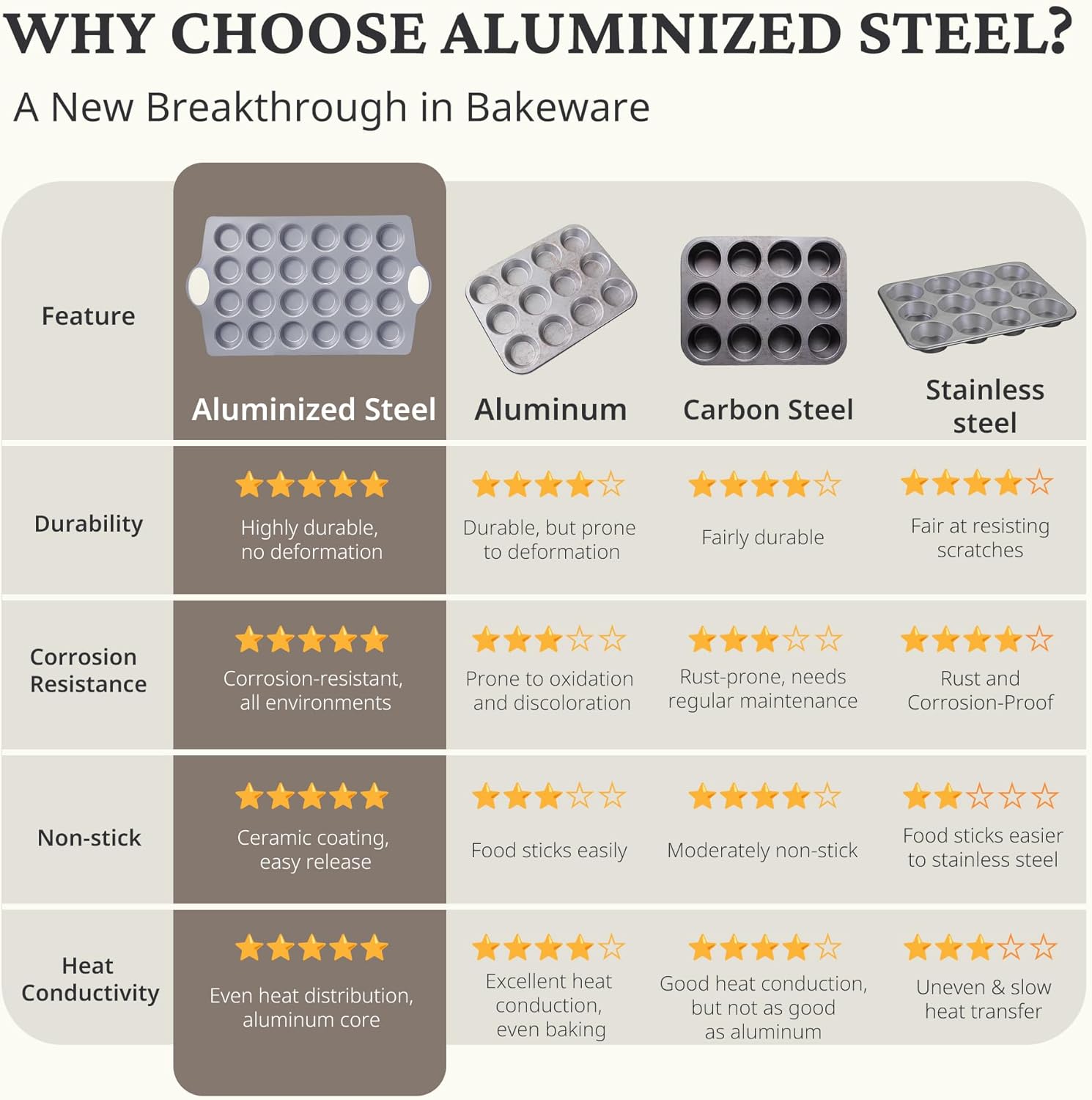 - Heavy-Duty Aluminized Steel : Our ceramic mini cupcake pans are crafted from high-quality aluminized steel, a new and advanced material offering 50% better corrosion resistance and durability compared to traditional pans. This innovative material provides even heat distribution, significantly reducing baking time and withstanding temperatures up to 500°F. Ideal for ovens, dishwashers, refrigerators, this muffin pan is designed to enhance convenience in every kitchen.