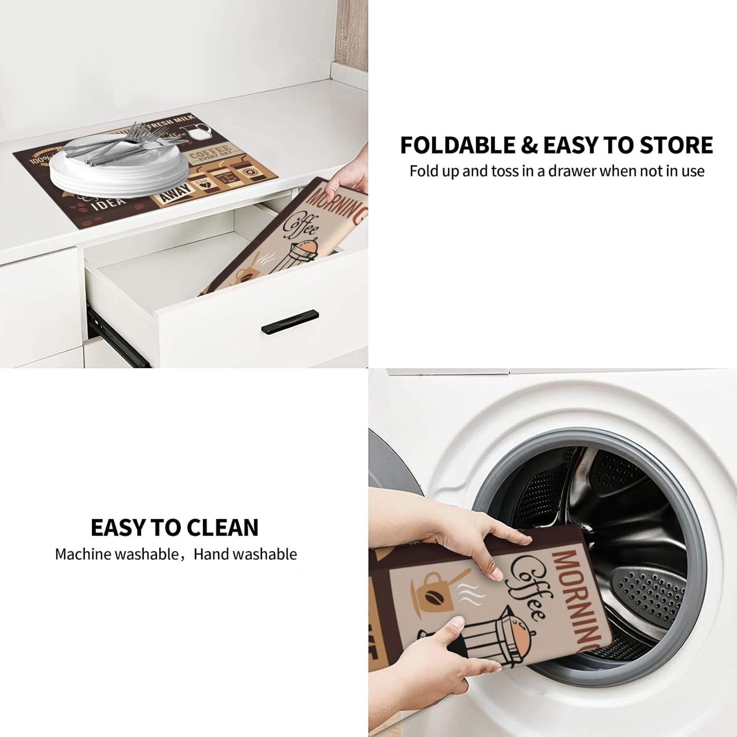 - Easy To Clean & Store -- The Drying Mat Is Machine Washable, Easy To Clean And Store. Fold And Slip Into A Drawer Or Cabinet When Not In Use. The Mat Can Also Be Hung On The Hook With The Tape
