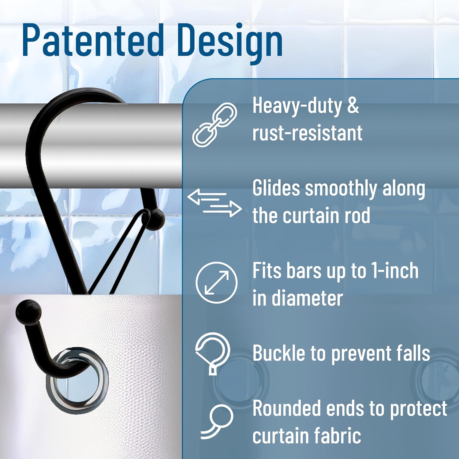 - ANTI-FALL SYSTEM: These S-shaped shower curtain hooks feature a unique locking mechanism that prevents them from falling off the bar, even when adjusting or moving the curtains, ensuring secure and hassle-free use.