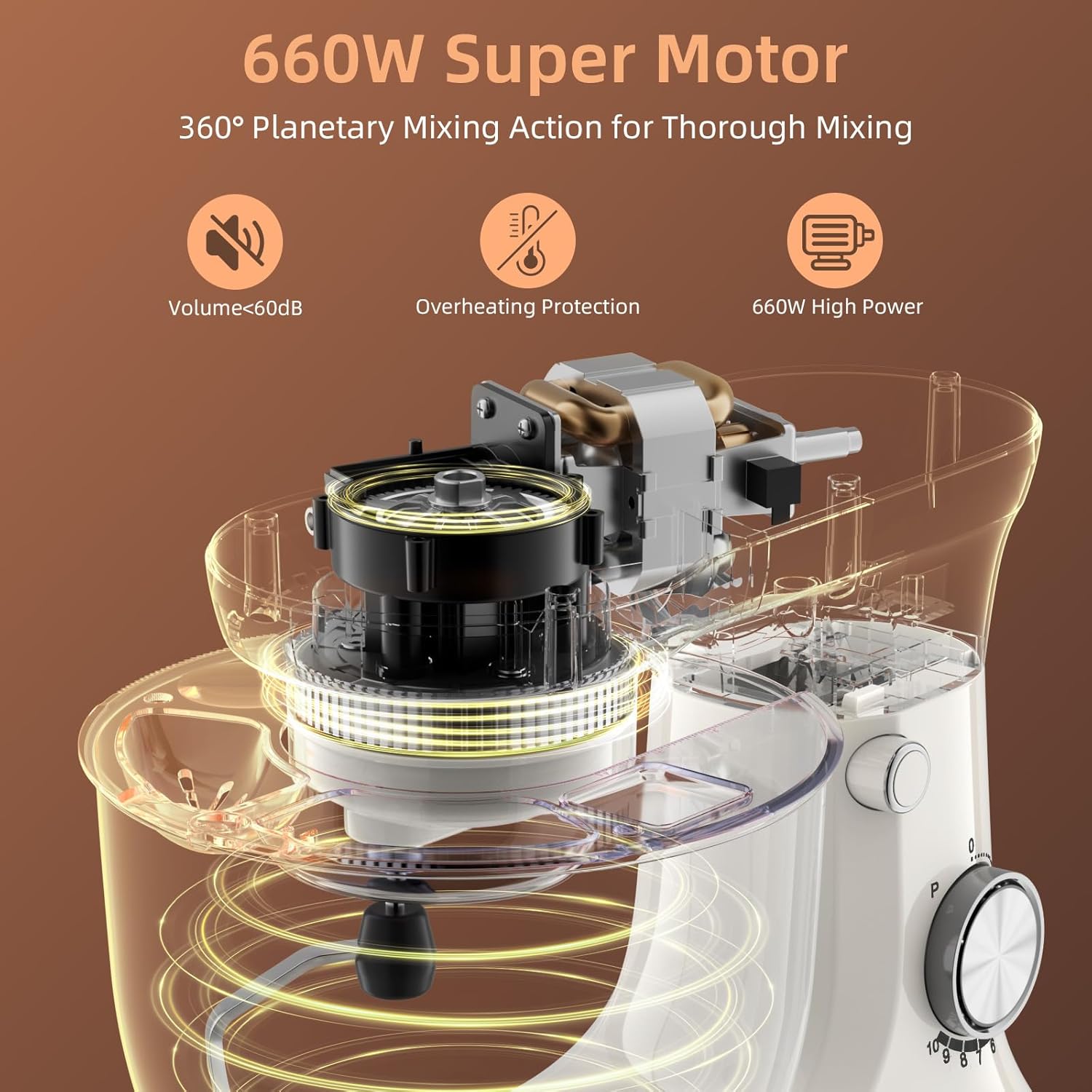 - 🍕EASY TO CLEAN AND COMPACT SIZE:The mixing head and bowl of Standing Mixer do not need to be cleaned after use, directly into the dishwasher can be rinsed at high temperature. Avoid improper cleaning damage to the accessories, prolong the service life, so that kitchen cleaning becomes easy and simple