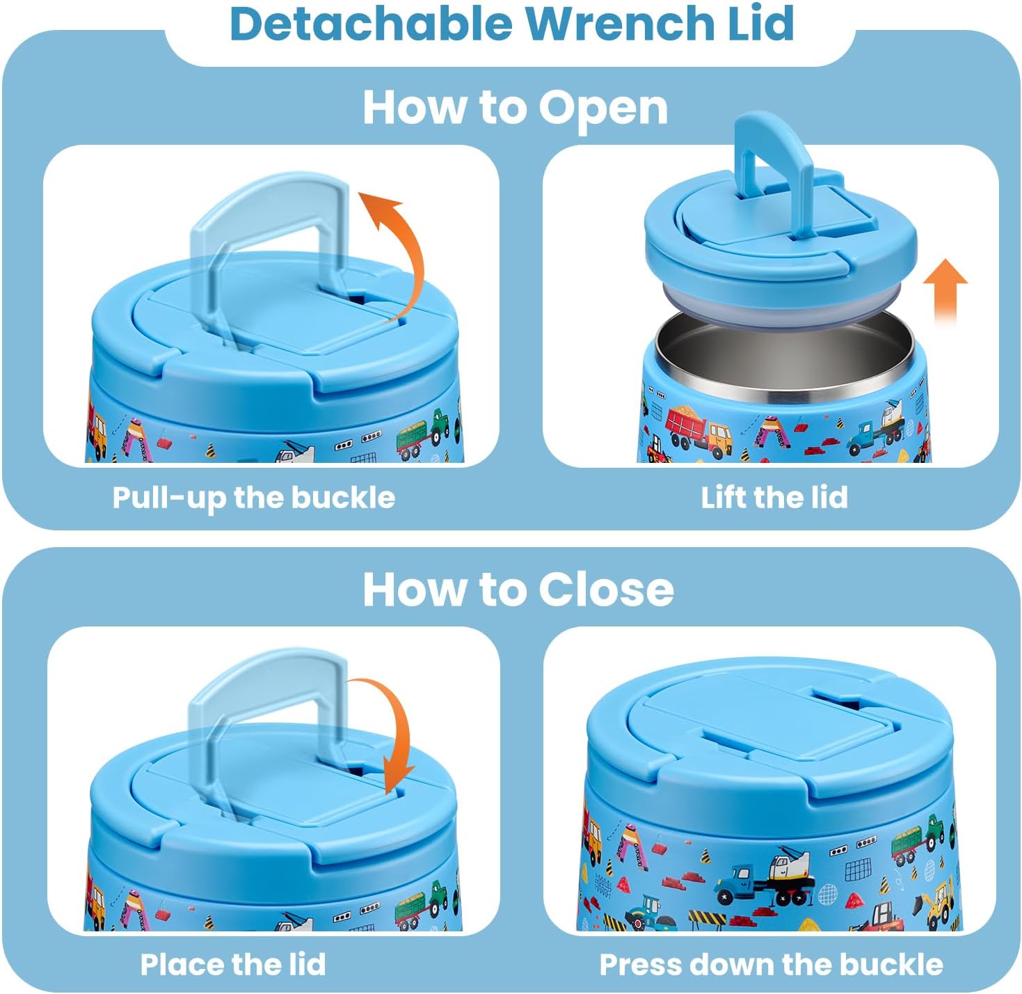 - New Buckle of Lid: The food containers feature a press-seal construction, allowing you to simply pull the handle upwards to 90° to open the lid/ 90° downward closure. This design is maintaining vacuum no need to rotate the lid open . Additionally, the container comes equipped with a carrying handle, making it convenient for your child to carry it. Whether at school, an outdoor outing, or a family gathering, this user-friendly design empowers children to confidently enjoy their delicious meals.
