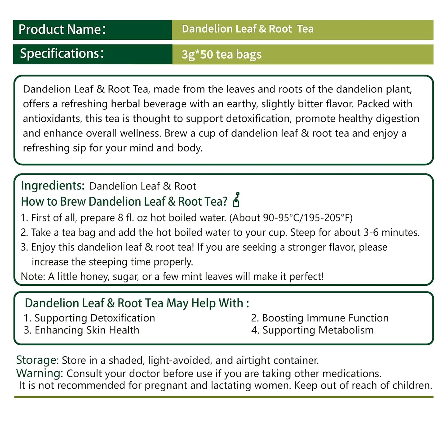 - [Wellness Tea]: Sourced from nutrient-rich soil, our dandelion leaf and root tea is made with hand-picked botanicals, free from artificial additives or chemicals. Each tea bag is expertly crafted to offer a flavorful and beneficial experience with every brew.