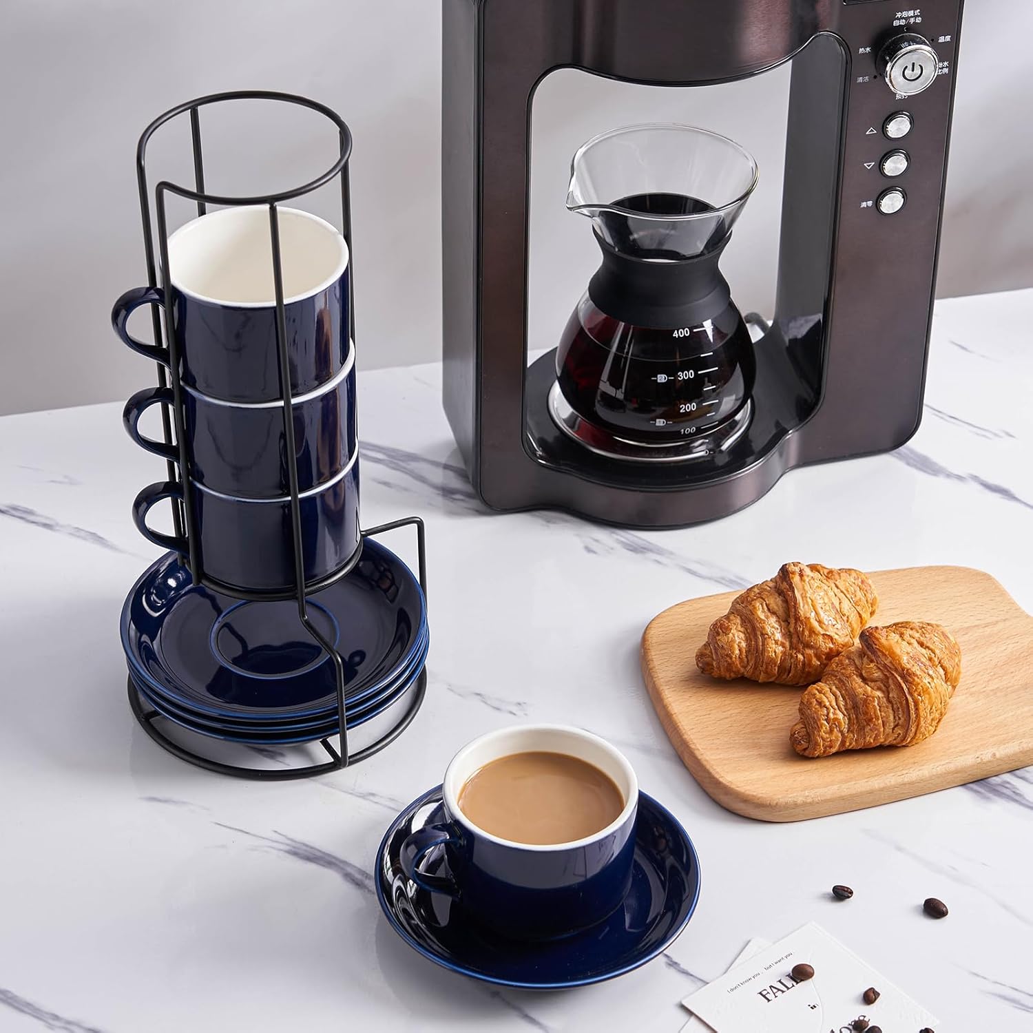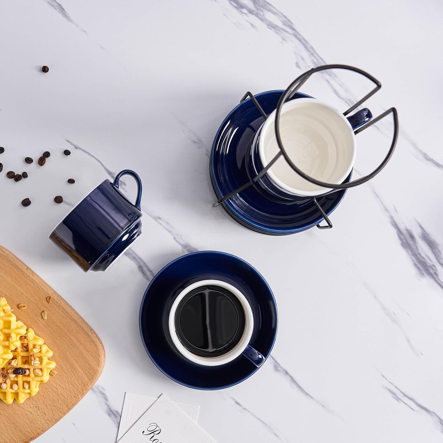 - 1. Elevate your kitchen experience with the YOLIFE Espresso Cups Set of 4. This set includes 4pcs 8 Ounce Espresso Cups with Saucers and Metal Stand, all in a classic ceramic blue color. Perfect for people who enjoy coffee and conversation!